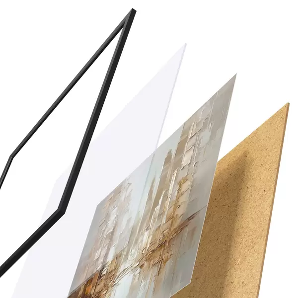 Das Poster besteht aus einem Rahmen, Plexiglas, einem gedruckten Bild und einer Rückwand aus Spanplatten. Dank der Halterungen auf der Rückseite kann das Poster sofort an die Wand gehängt werden.