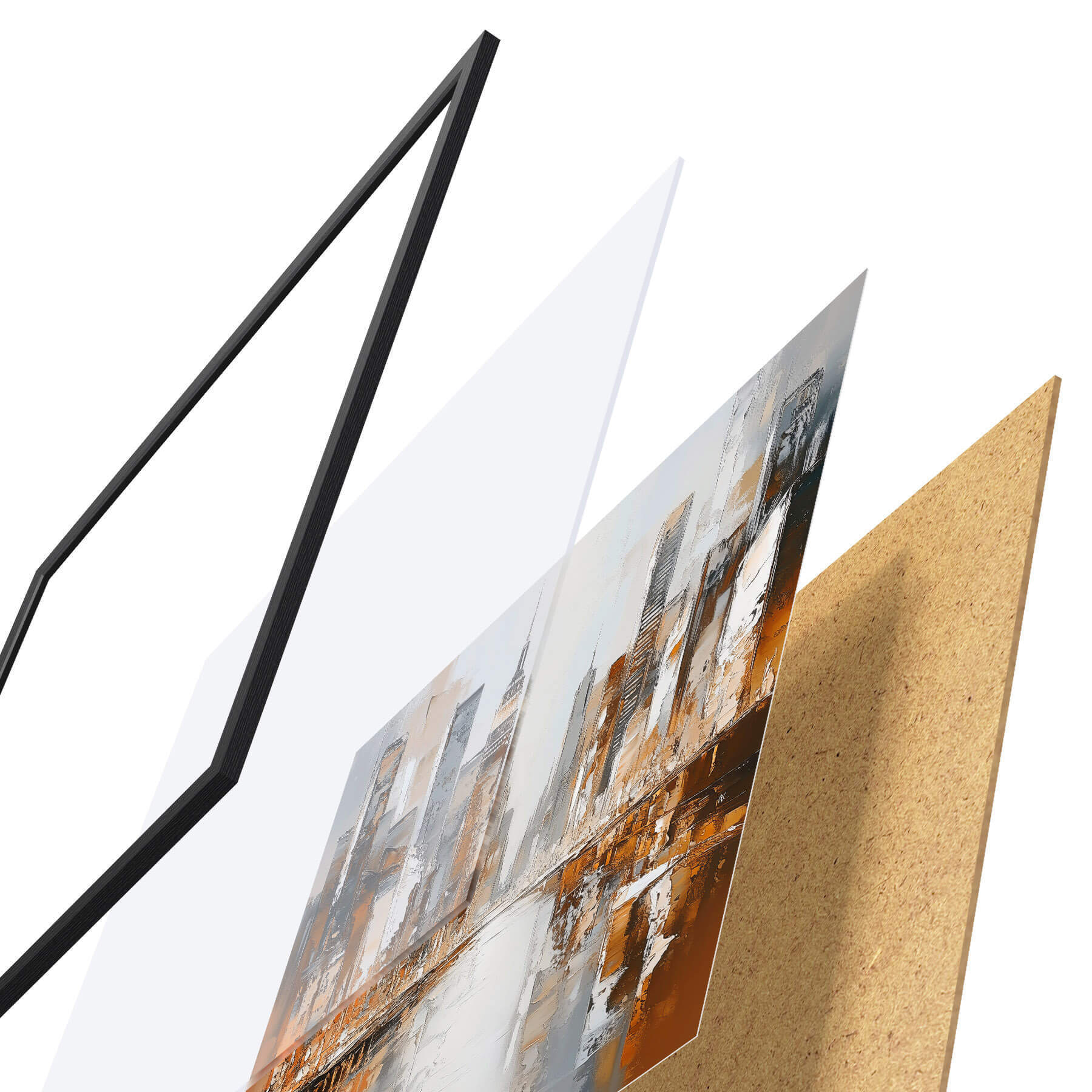 Das Poster besteht aus einem Rahmen, Plexiglas, einem gedruckten Bild und einer Rückwand aus Spanplatten. Dank der Halterungen auf der Rückseite kann das Poster sofort an die Wand gehängt werden.