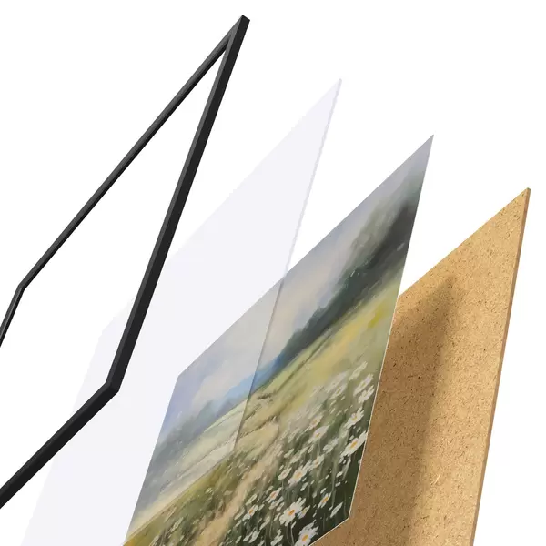 Das Poster besteht aus einem Rahmen, Plexiglas, einem gedruckten Bild und einer Rückwand aus Spanplatten. Dank der Halterungen auf der Rückseite kann das Poster sofort an die Wand gehängt werden.