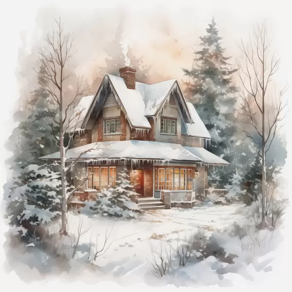 Poster Haus in einem verschneiten Wald Nachahmung von Aquarell f42137