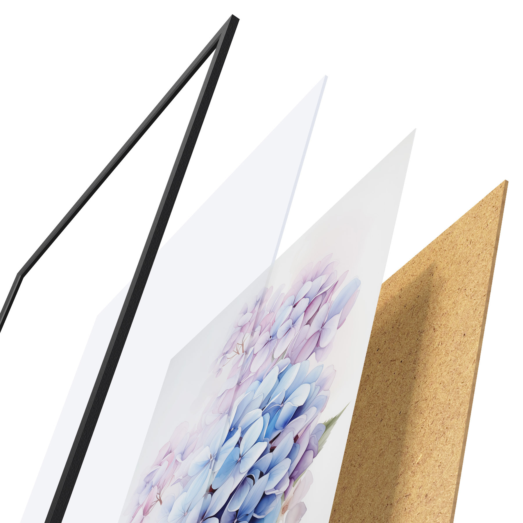 Das Poster besteht aus einem Rahmen, Plexiglas, einem gedruckten Bild und einer Rückwand aus Spanplatten. Dank der Halterungen auf der Rückseite kann das Poster sofort an die Wand gehängt werden.