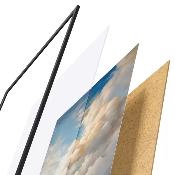 Das Poster besteht aus einem Rahmen, Plexiglas, einem gedruckten Bild und einer Rückwand aus Spanplatten. Dank der Halterungen auf der Rückseite kann das Poster sofort an die Wand gehängt werden.