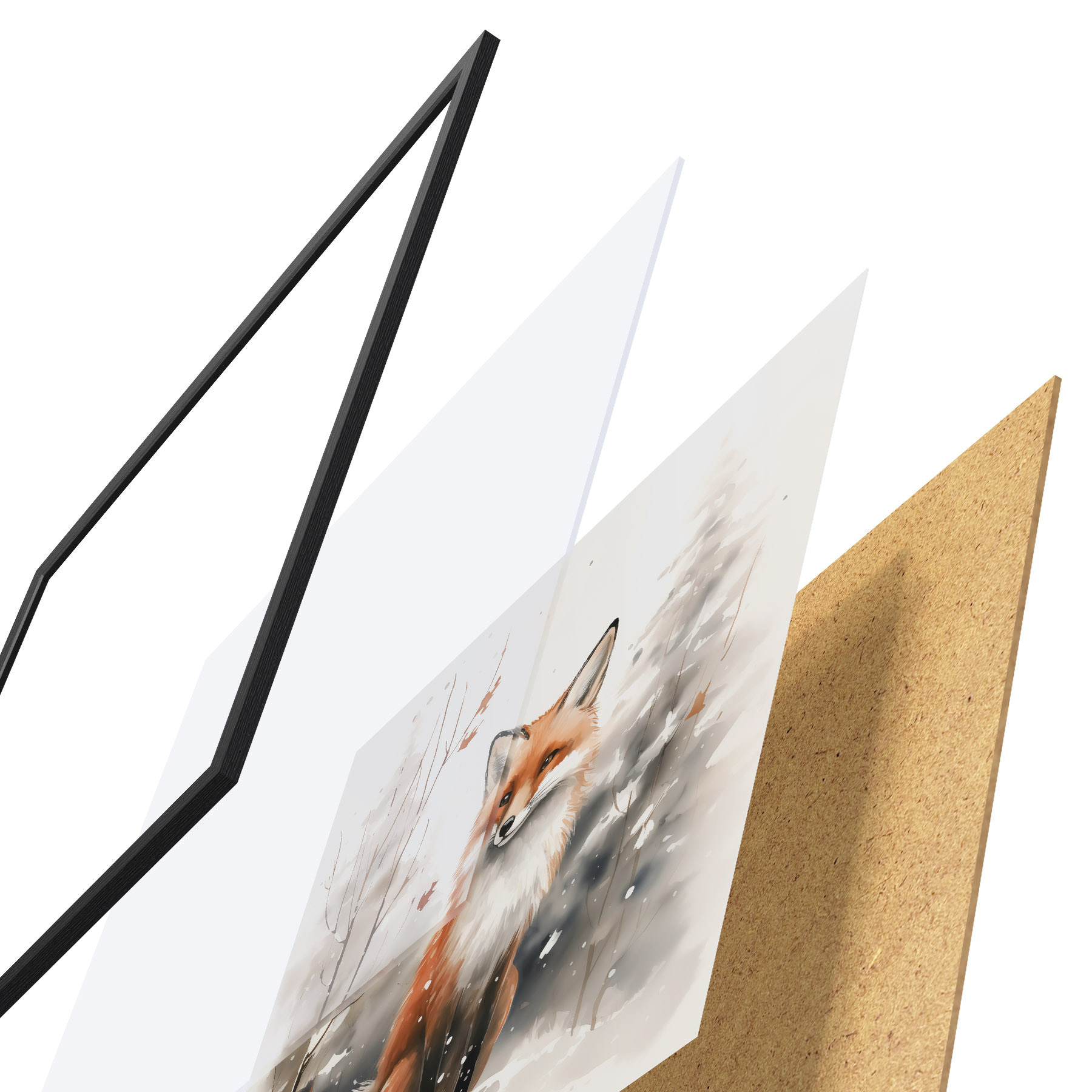 Das Poster besteht aus einem Rahmen, Plexiglas, einem gedruckten Bild und einer Rückwand aus Spanplatten. Dank der Halterungen auf der Rückseite kann das Poster sofort an die Wand gehängt werden.