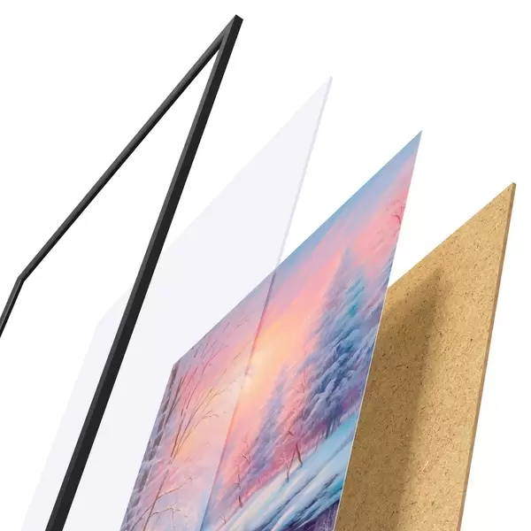 Das Poster besteht aus einem Rahmen, Plexiglas, einem gedruckten Bild und einer Rückwand aus Spanplatten. Dank der Halterungen auf der Rückseite kann das Poster sofort an die Wand gehängt werden.