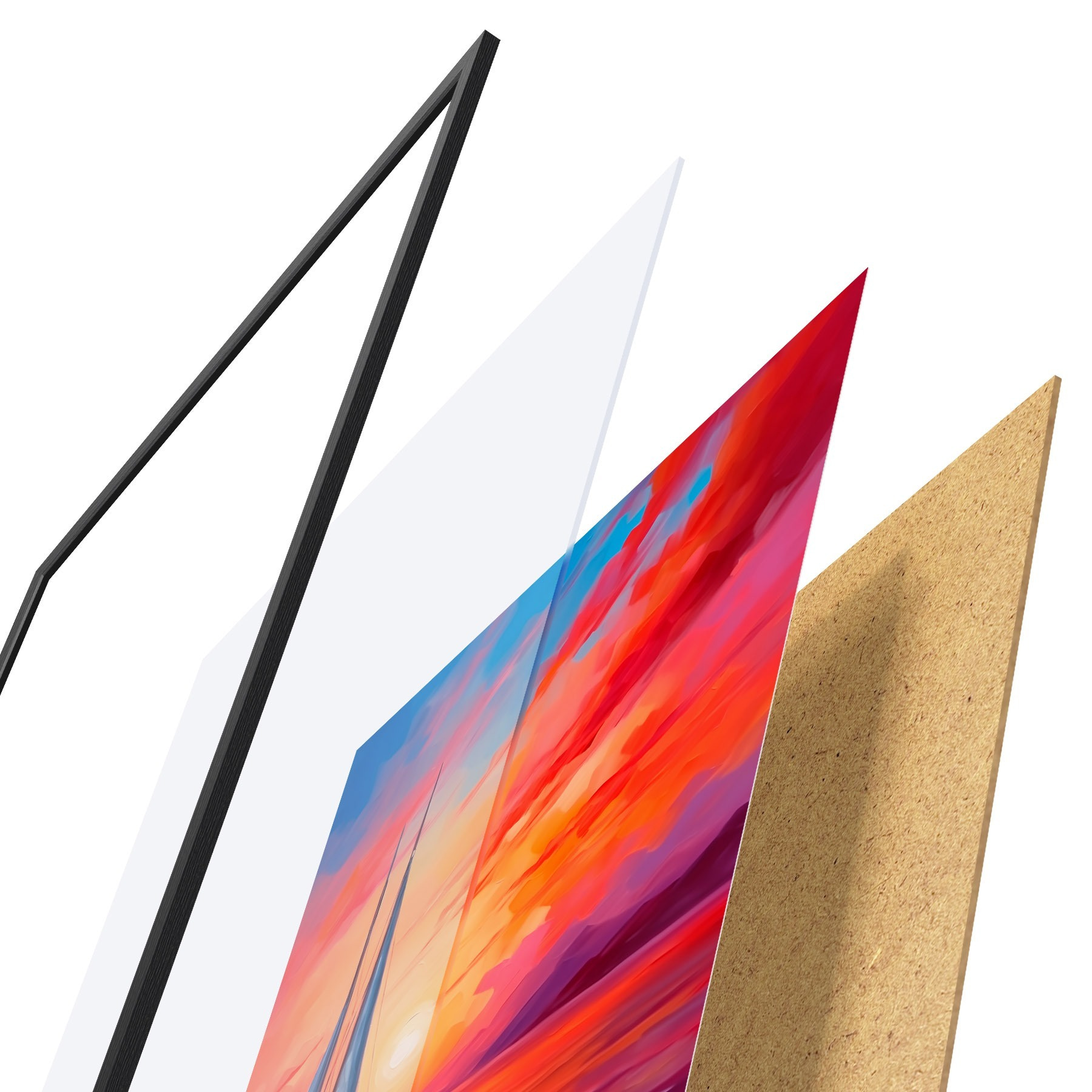 Das Poster besteht aus einem Rahmen, Plexiglas, einem gedruckten Bild und einer Rückwand aus Spanplatten. Dank der Halterungen auf der Rückseite kann das Poster sofort an die Wand gehängt werden.