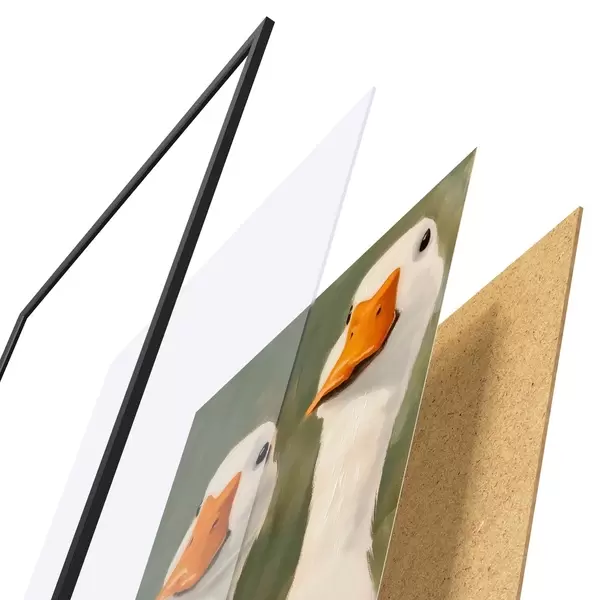 Das Poster besteht aus einem Rahmen, Plexiglas, einem gedruckten Bild und einer Rückwand aus Spanplatten. Dank der Halterungen auf der Rückseite kann das Poster sofort an die Wand gehängt werden.