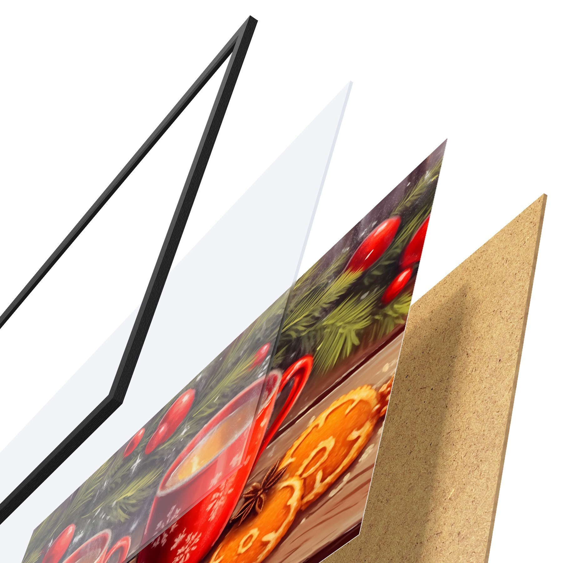 Das Poster besteht aus einem Rahmen, Plexiglas, einem gedruckten Bild und einer Rückwand aus Spanplatten. Dank der Halterungen auf der Rückseite kann das Poster sofort an die Wand gehängt werden.