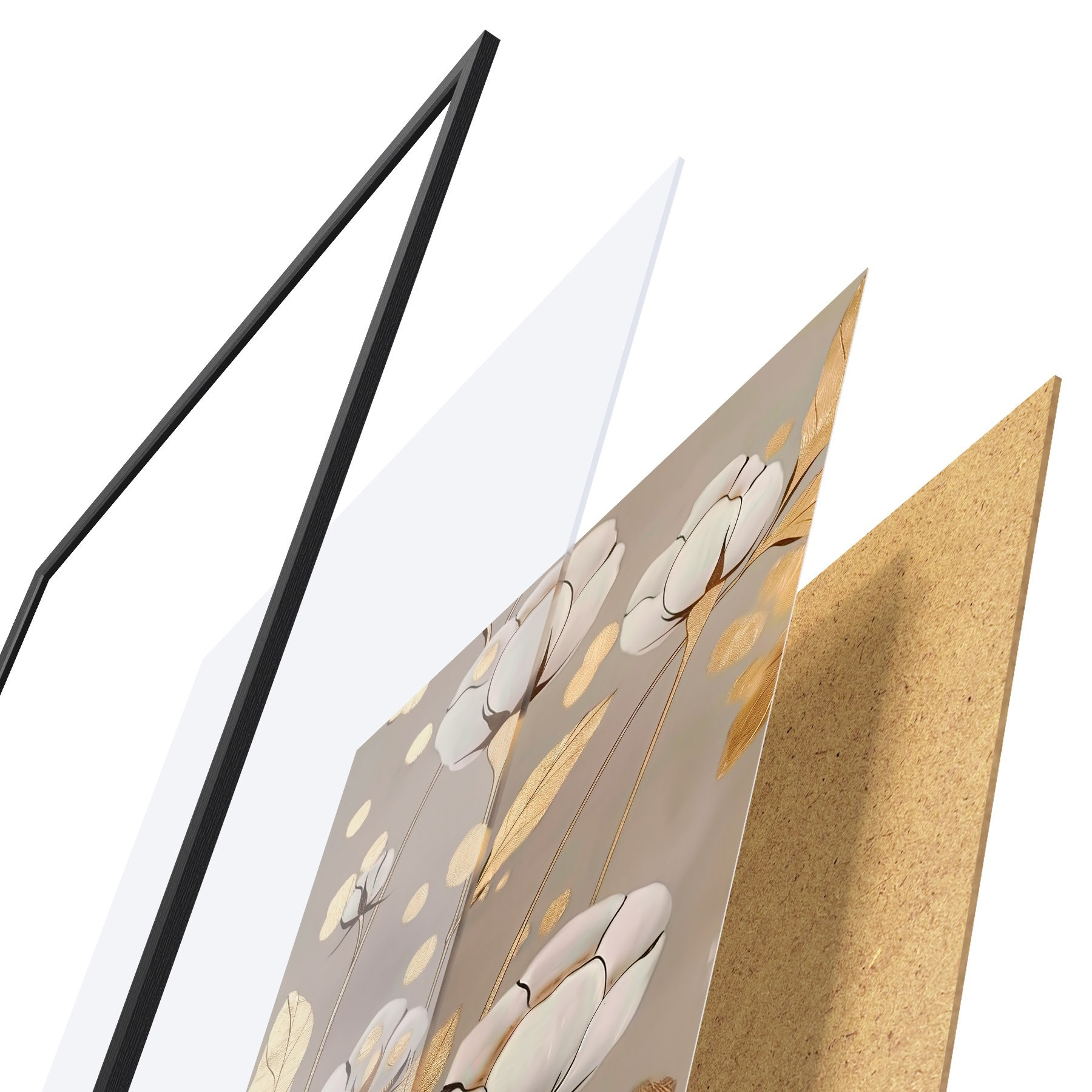 Das Poster besteht aus einem Rahmen, Plexiglas, einem gedruckten Bild und einer Rückwand aus Spanplatten. Dank der Halterungen auf der Rückseite kann das Poster sofort an die Wand gehängt werden.