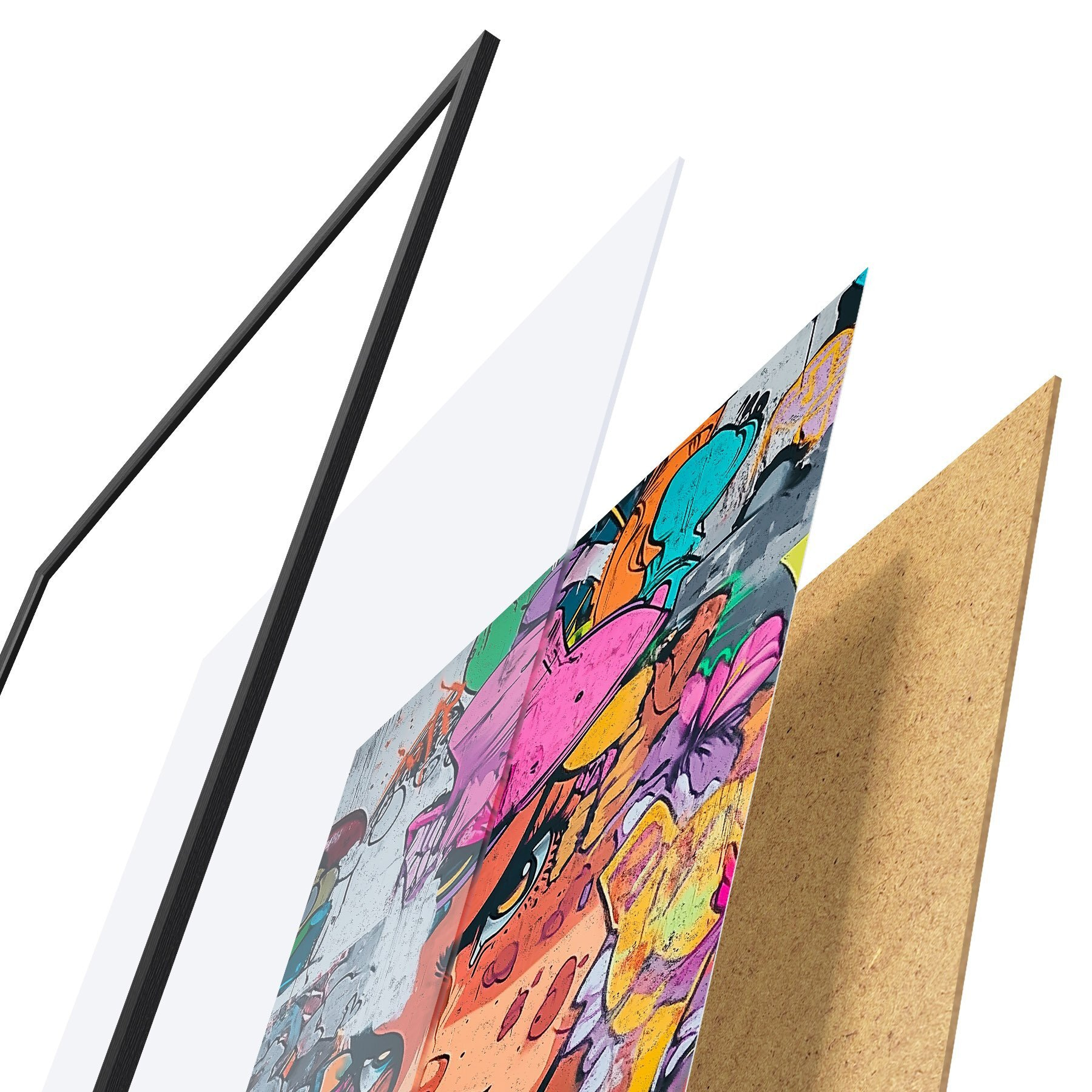 Das Poster besteht aus einem Rahmen, Plexiglas, einem gedruckten Bild und einer Rückwand aus Spanplatten. Dank der Halterungen auf der Rückseite kann das Poster sofort an die Wand gehängt werden.
