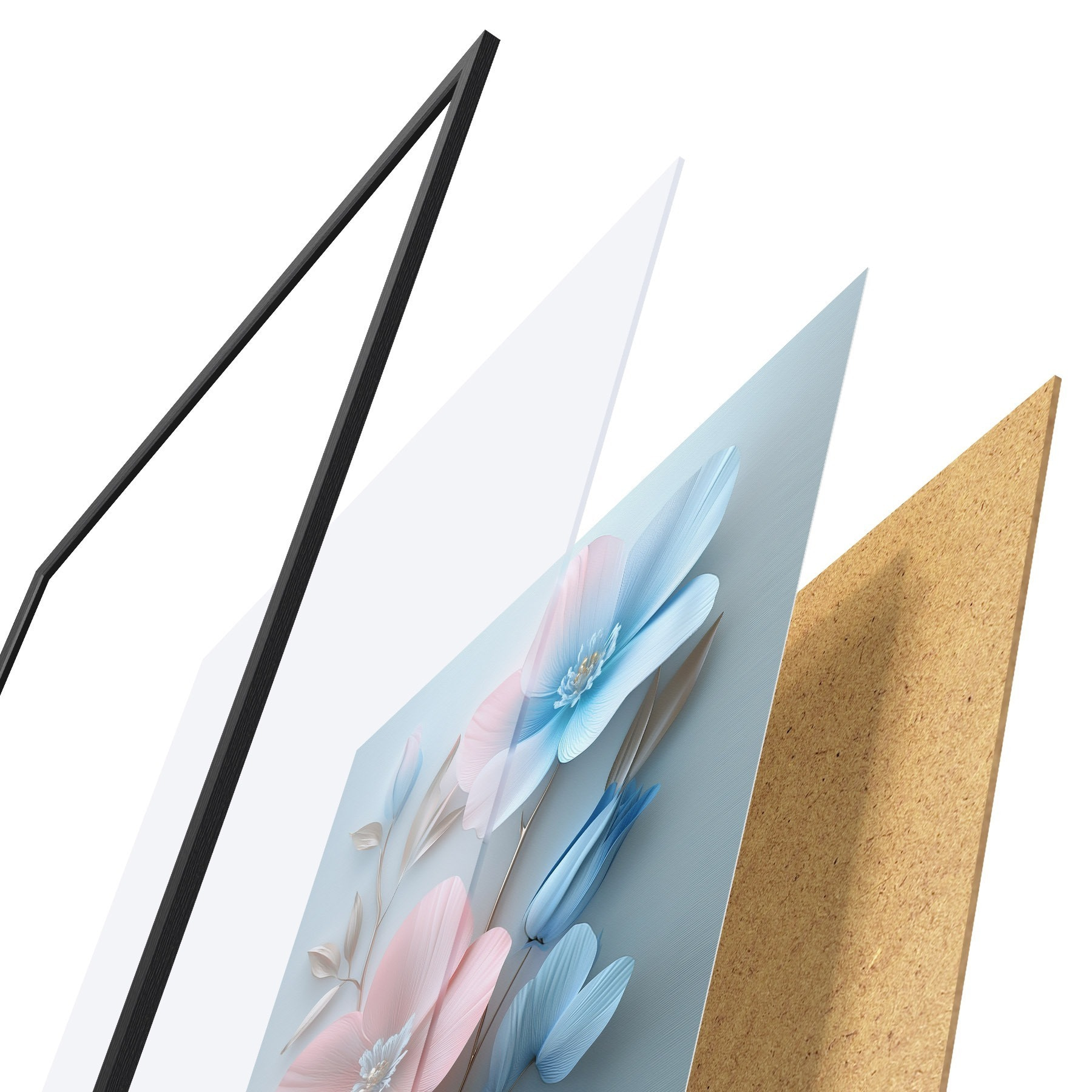 Das Poster besteht aus einem Rahmen, Plexiglas, einem gedruckten Bild und einer Rückwand aus Spanplatten. Dank der Halterungen auf der Rückseite kann das Poster sofort an die Wand gehängt werden.