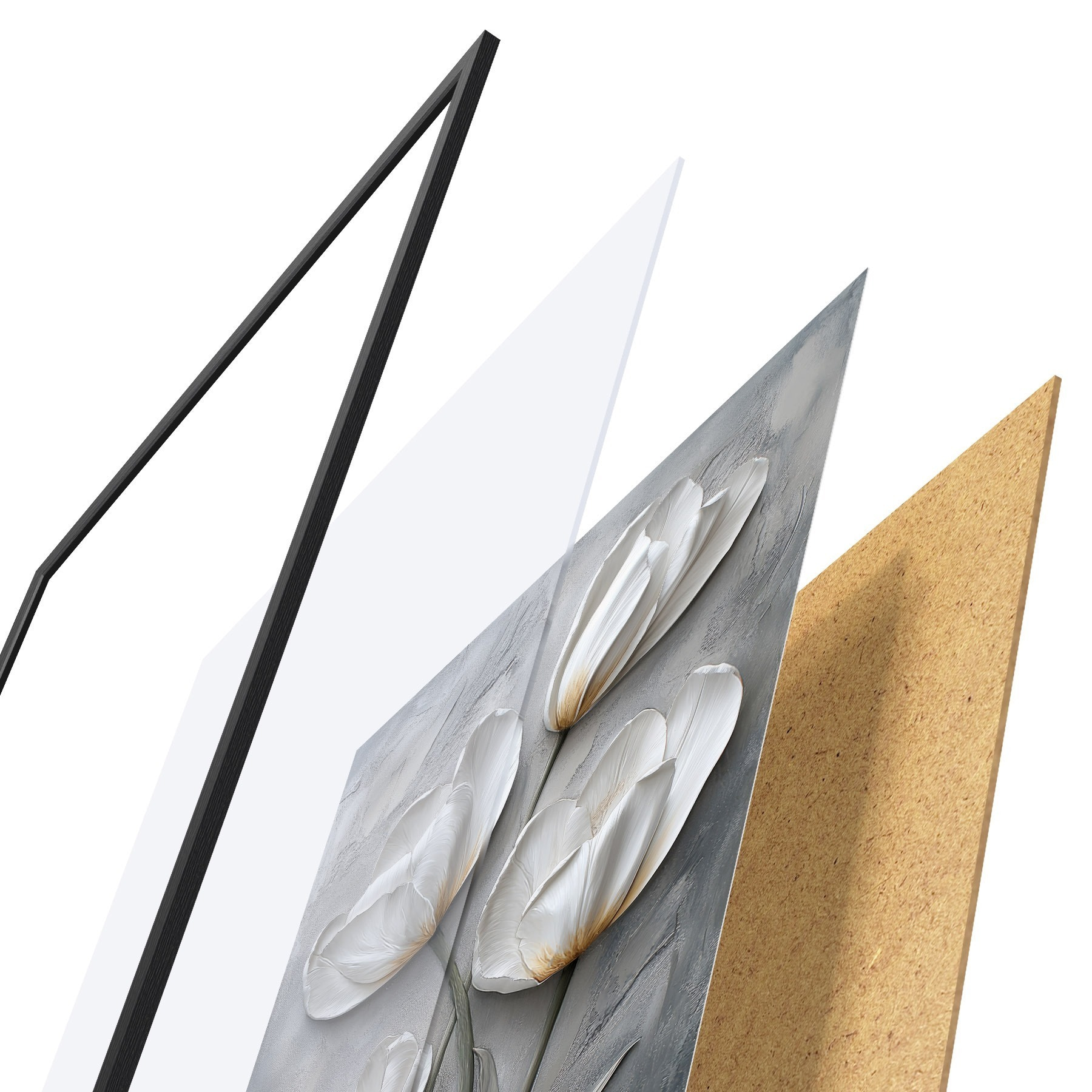 Das Poster besteht aus einem Rahmen, Plexiglas, einem gedruckten Bild und einer Rückwand aus Spanplatten. Dank der Halterungen auf der Rückseite kann das Poster sofort an die Wand gehängt werden.