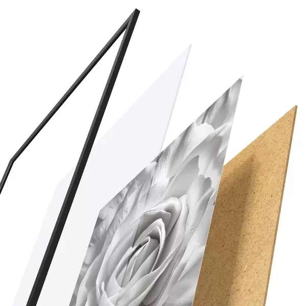 Das Poster besteht aus einem Rahmen, Plexiglas, einem gedruckten Bild und einer Rückwand aus Spanplatten. Dank der Halterungen auf der Rückseite kann das Poster sofort an die Wand gehängt werden.