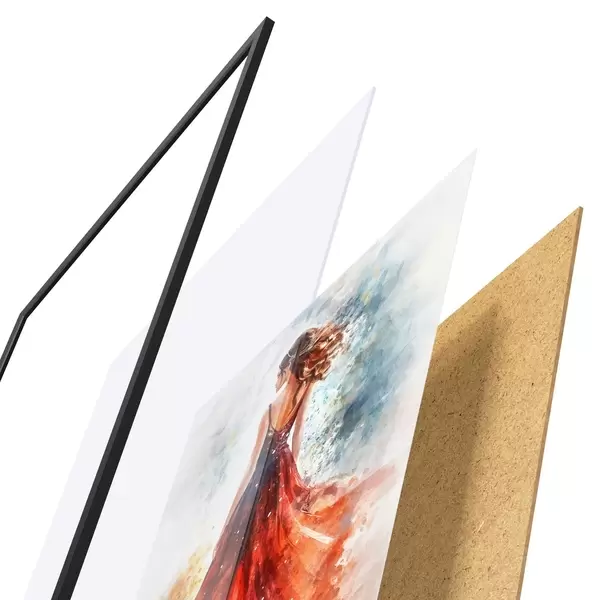 Das Poster besteht aus einem Rahmen, Plexiglas, einem gedruckten Bild und einer Rückwand aus Spanplatten. Dank der Halterungen auf der Rückseite kann das Poster sofort an die Wand gehängt werden.