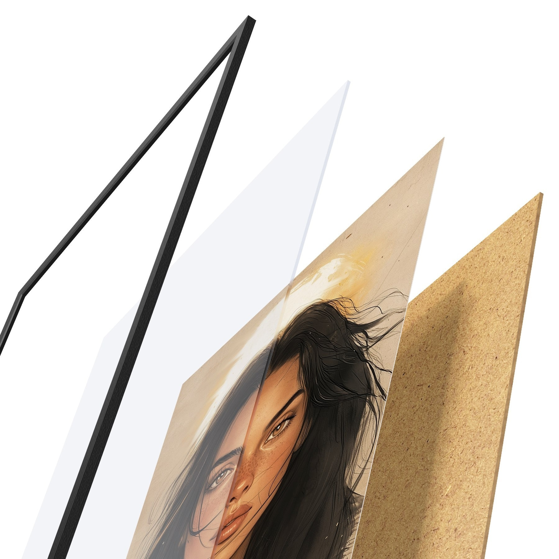 Das Poster besteht aus einem Rahmen, Plexiglas, einem gedruckten Bild und einer Rückwand aus Spanplatten. Dank der Halterungen auf der Rückseite kann das Poster sofort an die Wand gehängt werden.