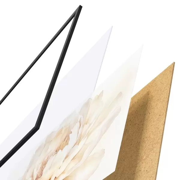 Das Poster besteht aus einem Rahmen, Plexiglas, einem gedruckten Bild und einer Rückwand aus Spanplatten. Dank der Halterungen auf der Rückseite kann das Poster sofort an die Wand gehängt werden.