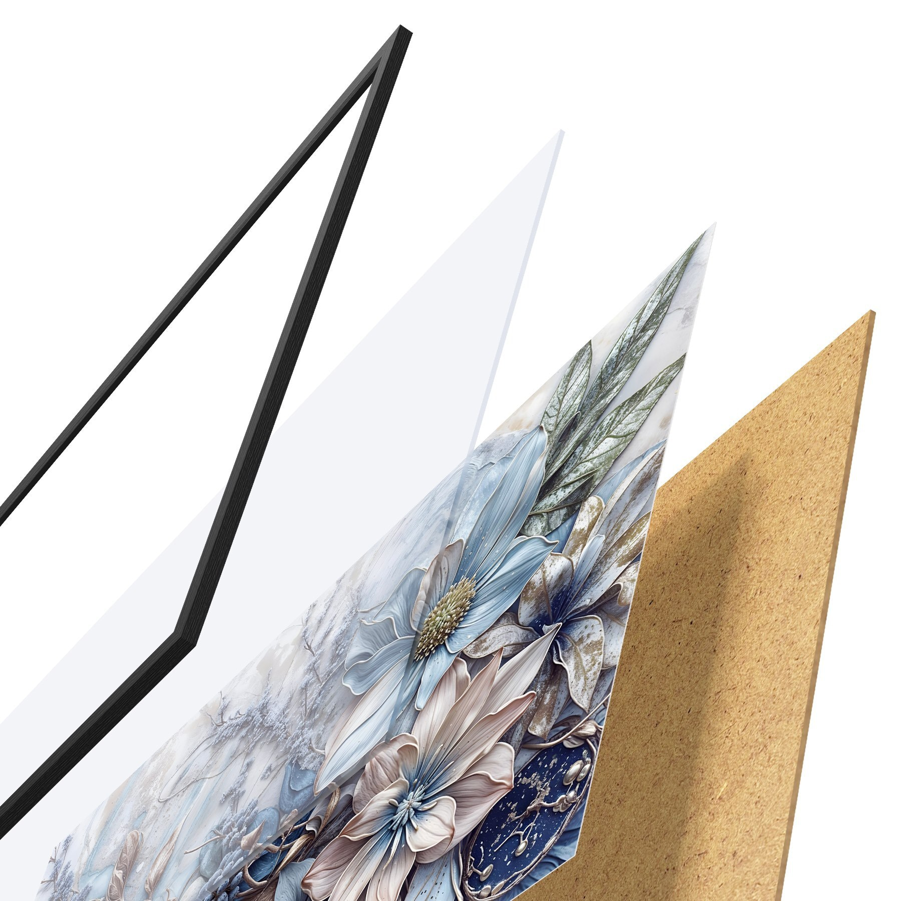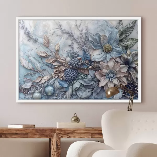 Poster Detaillierte, strukturierte, abstrakte, üppige Blumen mit großen, leuchtend blauen und rosa Blumen, Beeren und anderen botanischen Elementen Nr f42210