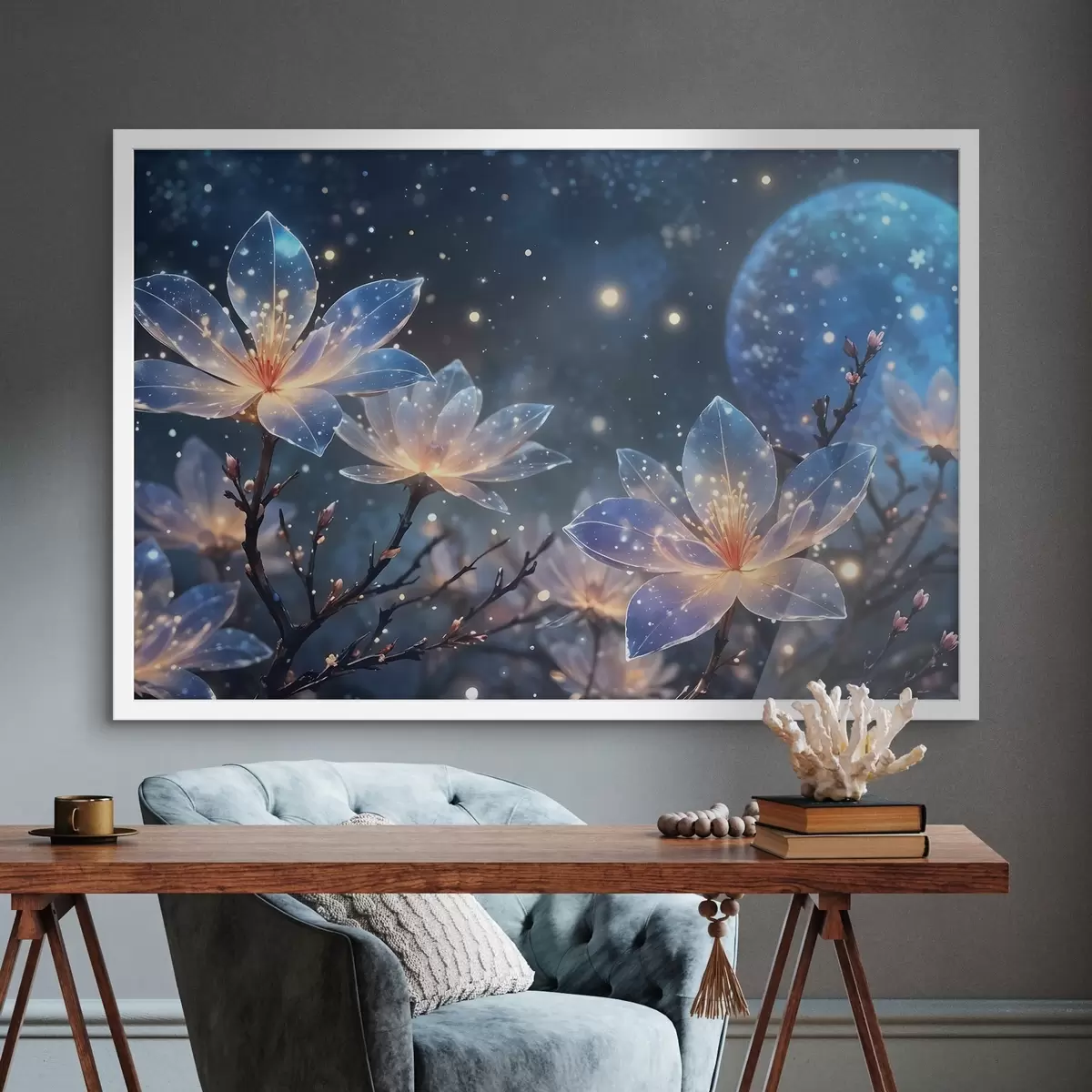 Poster Abstrakte Fantasie Blumen auf Zweigen mit strukturierten Blütenblättern mit Sternen und einem Mond in einem Nachthimmel Hintergrund f42211