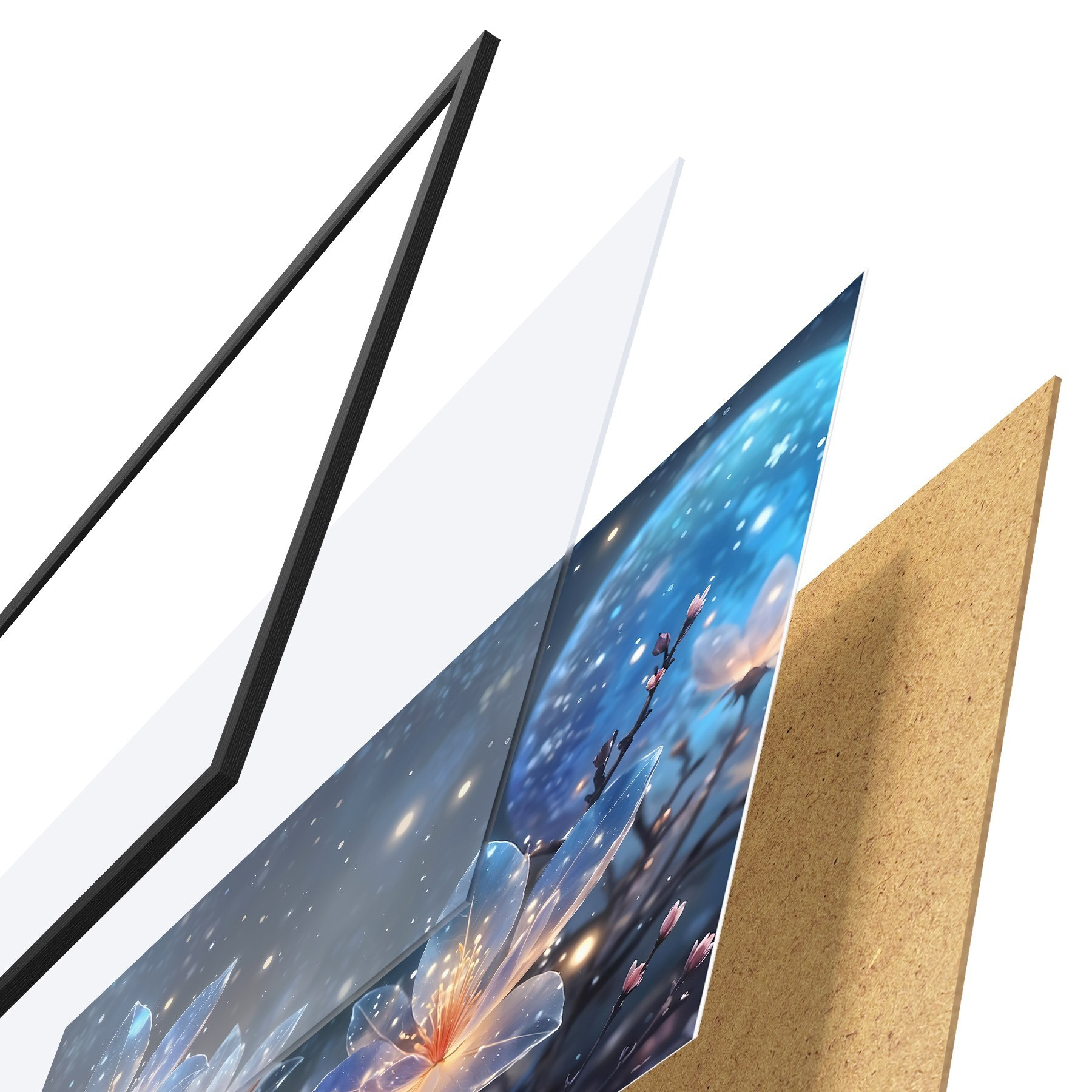 Das Poster besteht aus einem Rahmen, Plexiglas, einem gedruckten Bild und einer Rückwand aus Spanplatten. Dank der Halterungen auf der Rückseite kann das Poster sofort an die Wand gehängt werden.
