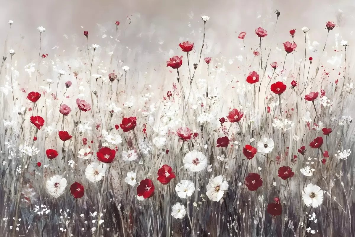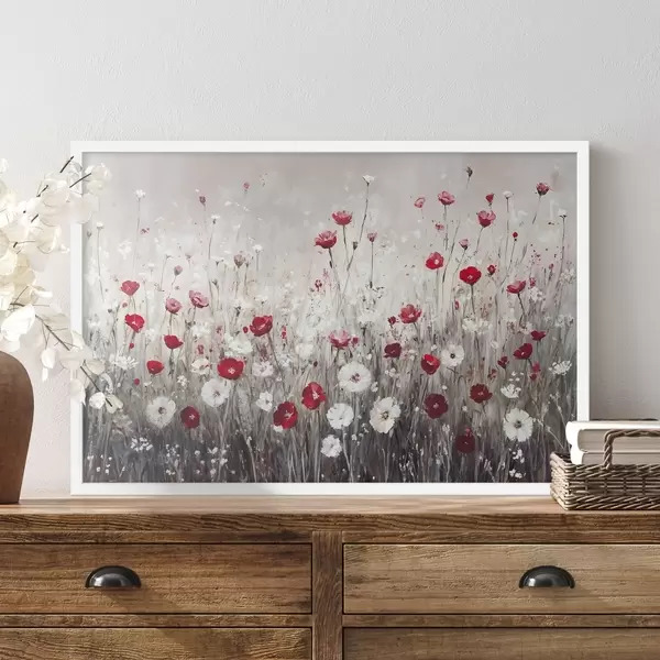 Poster Abstrakte Nachahmung der Ölmalerei ein Feld von roten und weißen Mohnblumen und Gänseblümchen vor einem grauen strukturierten Hintergrund f42213