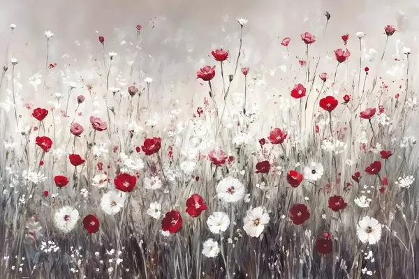Poster Abstrakte Nachahmung der Ölmalerei ein Feld von roten und weißen Mohnblumen und Gänseblümchen vor einem grauen strukturierten Hintergrund Nr f42213