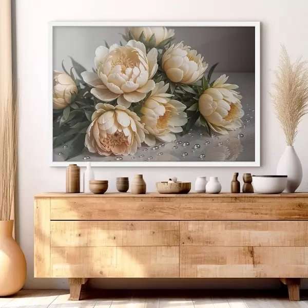 Poster Cremefarbene detaillierte Pfingstrose Blumen mit dunkelgrünen Blättern auf einem grauen Hintergrund Nr f42215