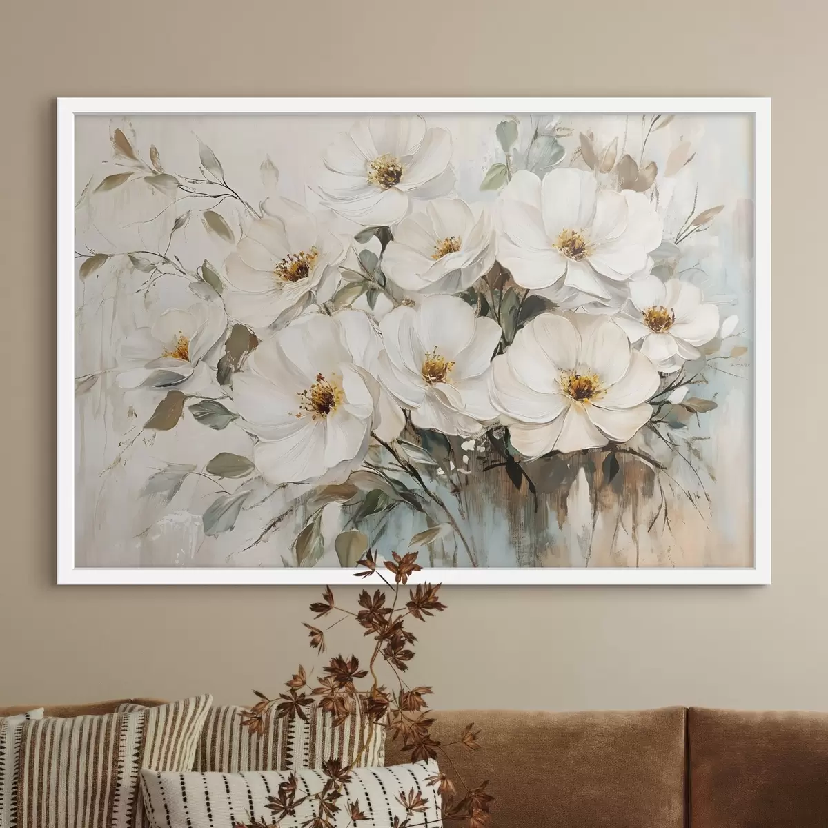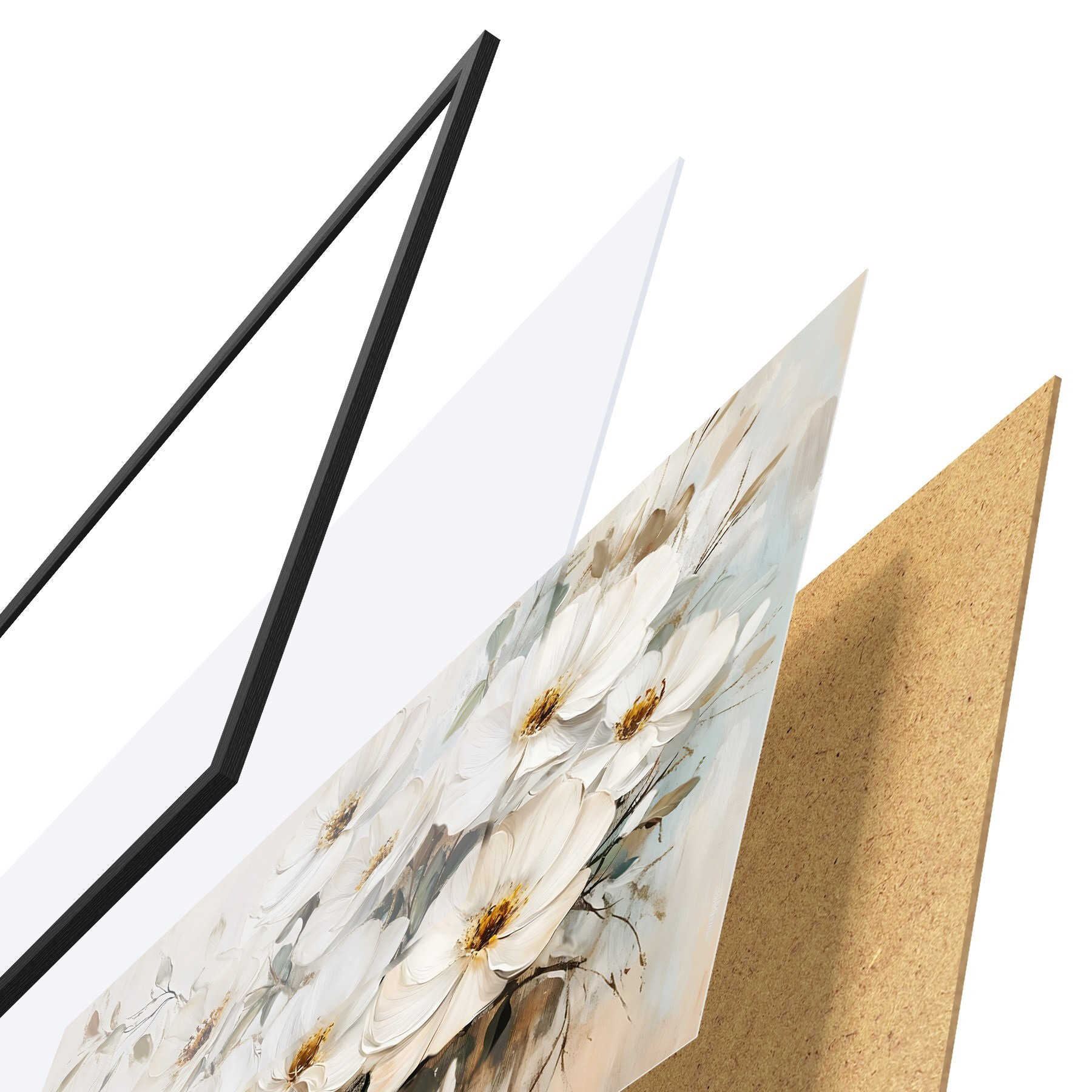 Poster Ein Strauß großer weißer Blumen in Ölmalerei Stil mit gelben Zentren vor einem hellen Hintergrund Nr f42222