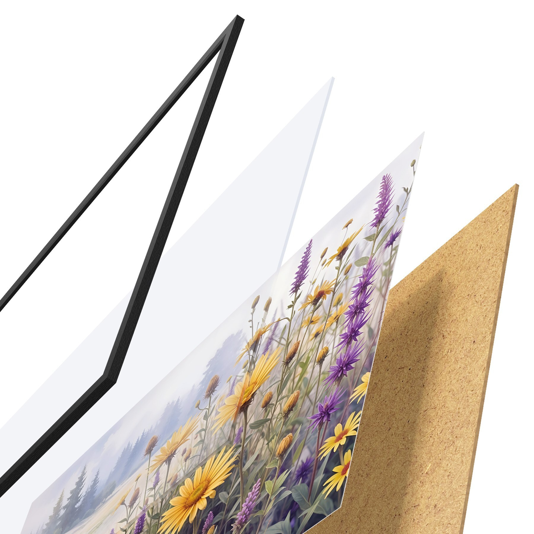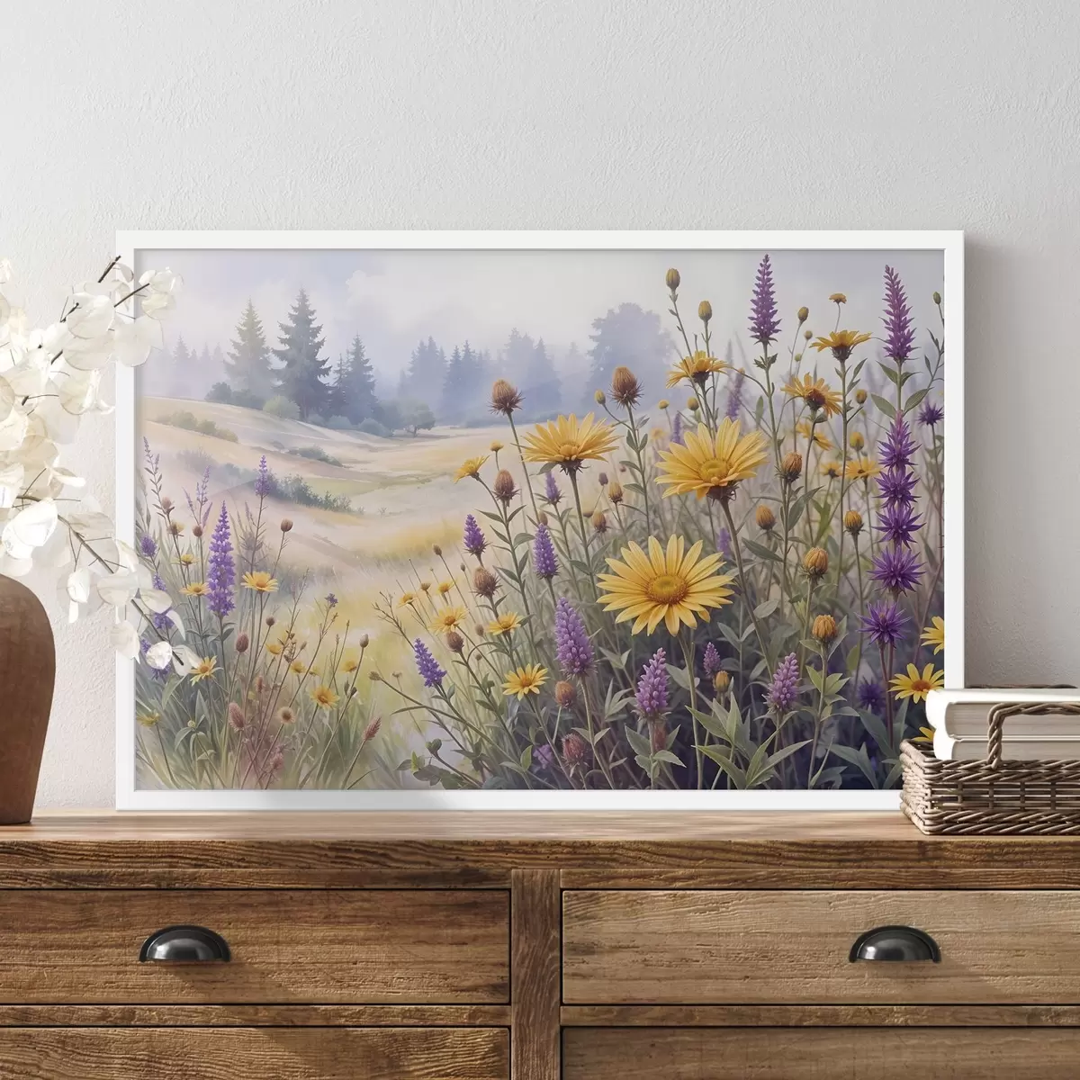 Poster Ein Feld mit gelben Sonnenblumen und lila Wildblumen in einer nebligen Waldlandschaft mit Kiefern im Hintergrund Nr f42223