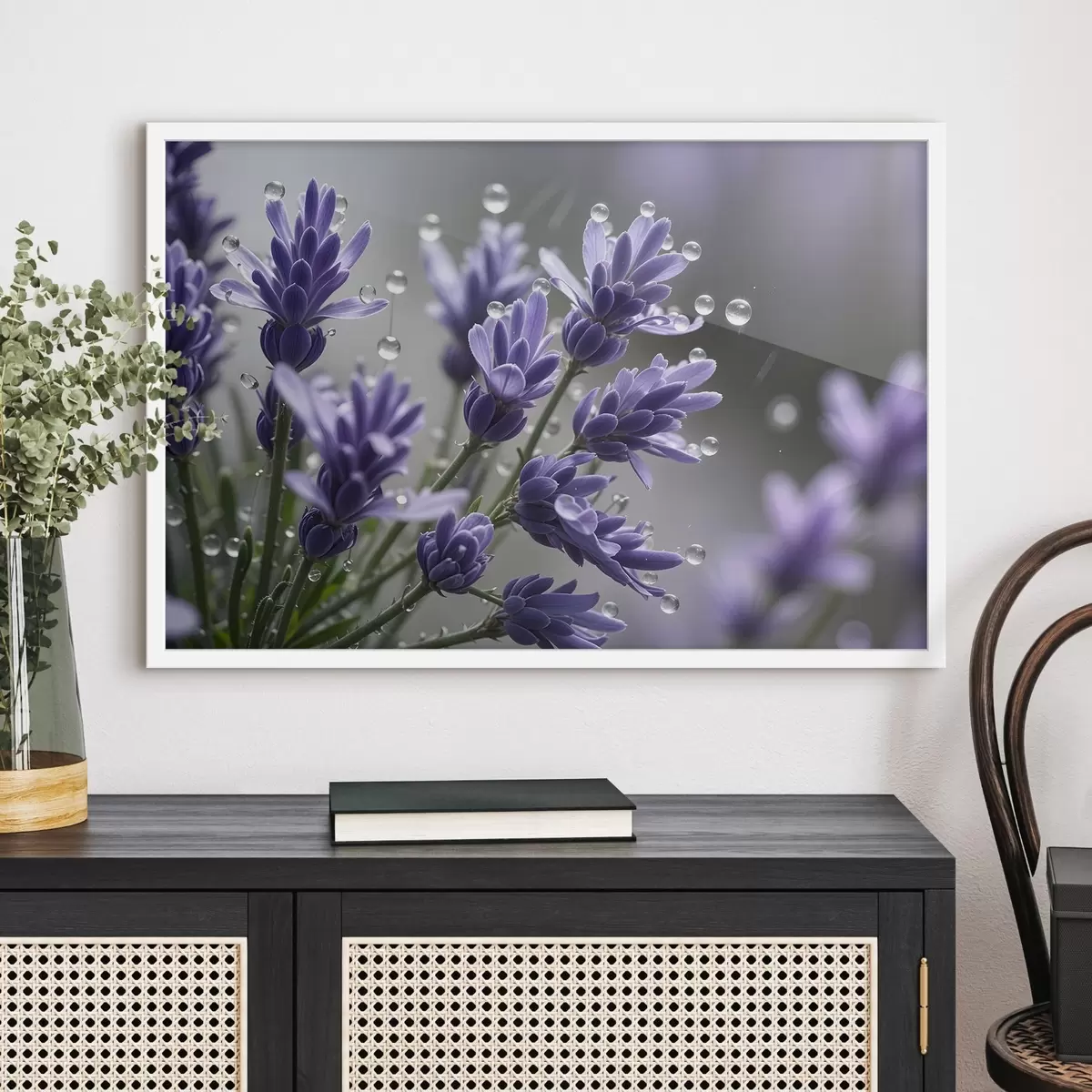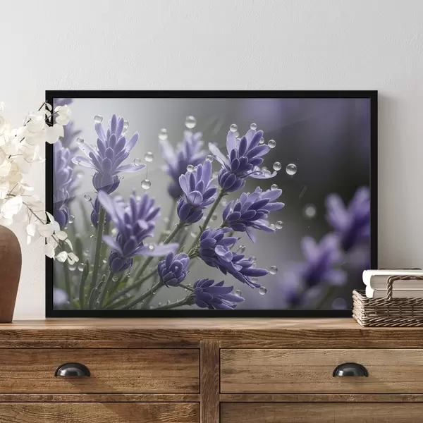 Poster Lila Lavendelblüten mit Wassertropfen auf den Blütenblättern, vor einem unscharfen Hintergrund f42229