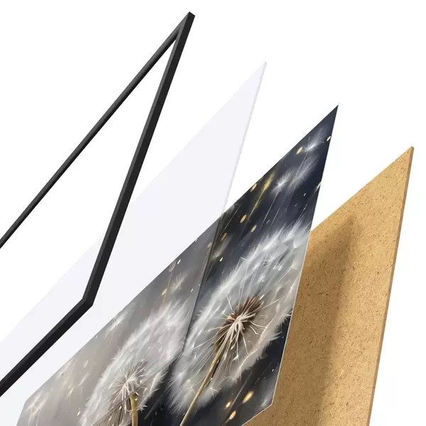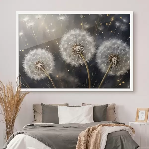 Poster Löwenzahnblüten mit ihren flauschigen weißen Samenköpfen vor einem dunklen Hintergrund, der eine magische Atmosphäre schafft Nr f42235