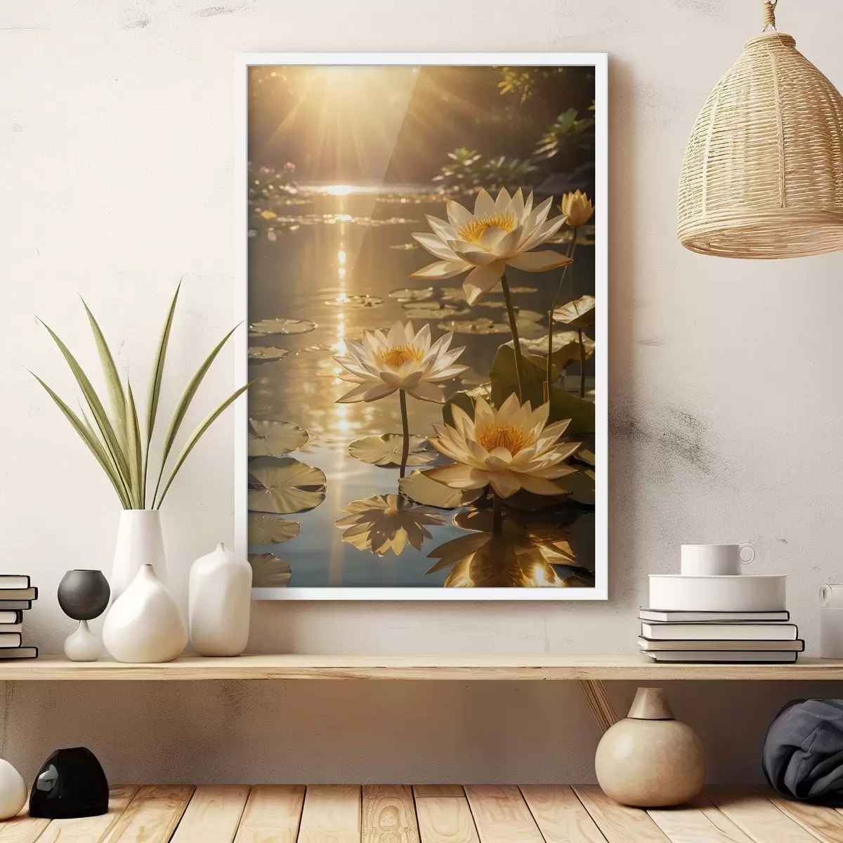 Poster Weiße Lotusblumen, die mit der Sonne auf einem ruhigen Teich schwimmen und eine heitere und ruhige Atmosphäre schaffen f42239