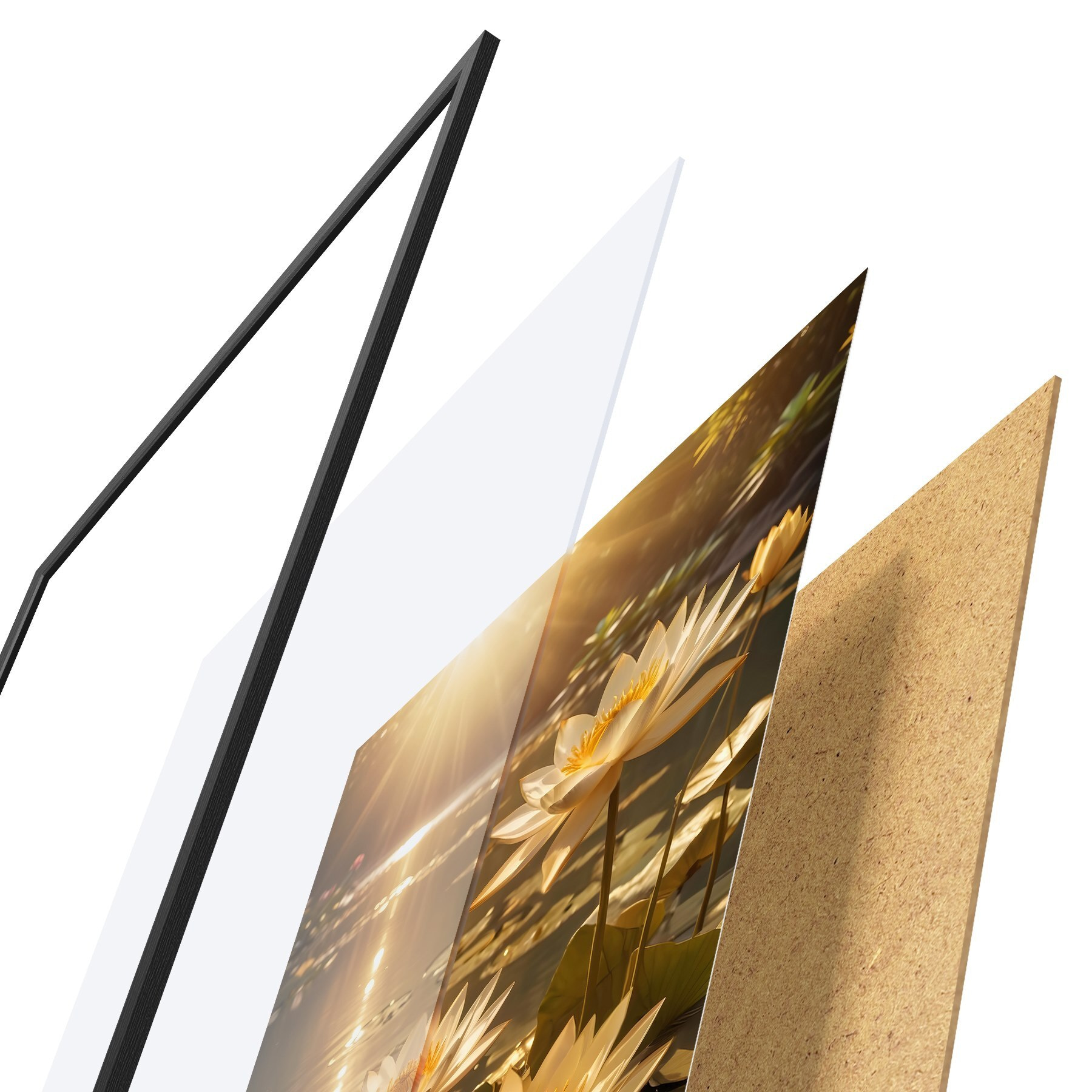 Das Poster besteht aus einem Rahmen, Plexiglas, einem gedruckten Bild und einer Rückwand aus Spanplatten. Dank der Halterungen auf der Rückseite kann das Poster sofort an die Wand gehängt werden.