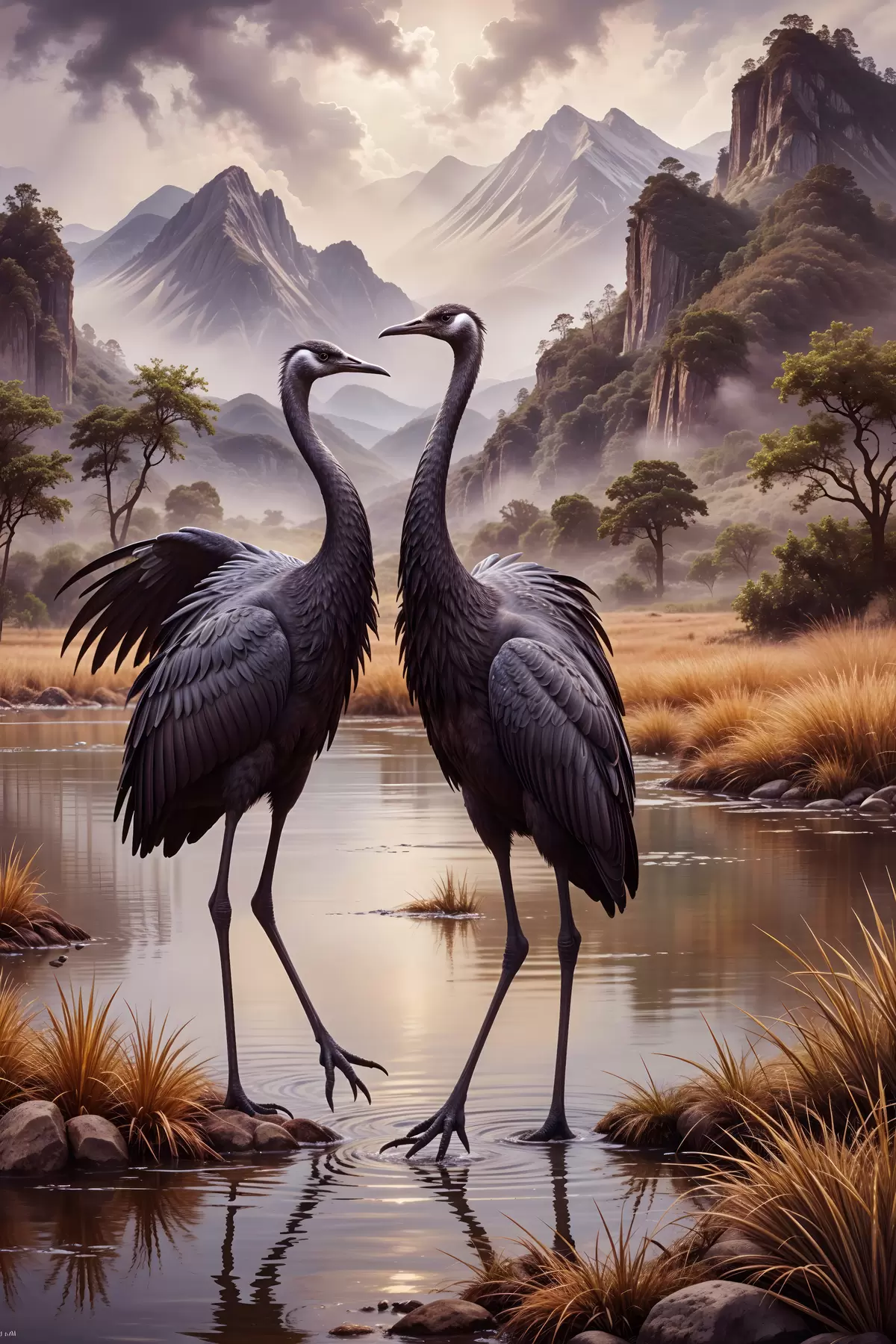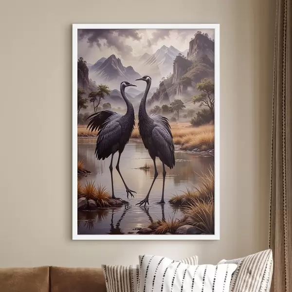 Poster Zwei große schwarze Kraniche, die in einem flachen Teich stehen, mit einer bergigen Landschaft im Hintergrund Nr f42240