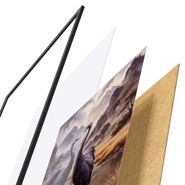 Das Poster besteht aus einem Rahmen, Plexiglas, einem gedruckten Bild und einer Rückwand aus Spanplatten. Dank der Halterungen auf der Rückseite kann das Poster sofort an die Wand gehängt werden.