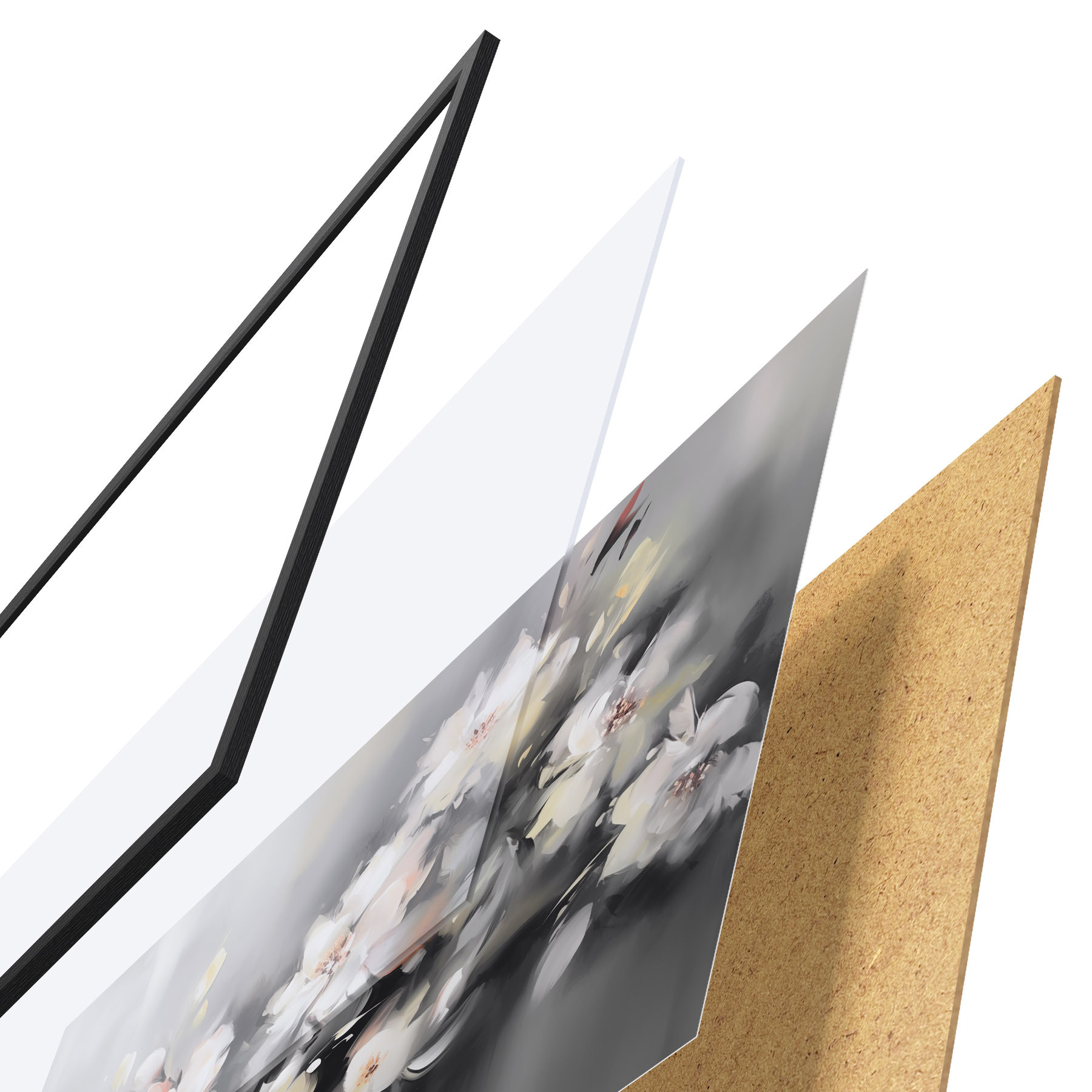Das Poster besteht aus einem Rahmen, Plexiglas, einem gedruckten Bild und einer Rückwand aus Spanplatten. Dank der Halterungen auf der Rückseite kann das Poster sofort an die Wand gehängt werden.