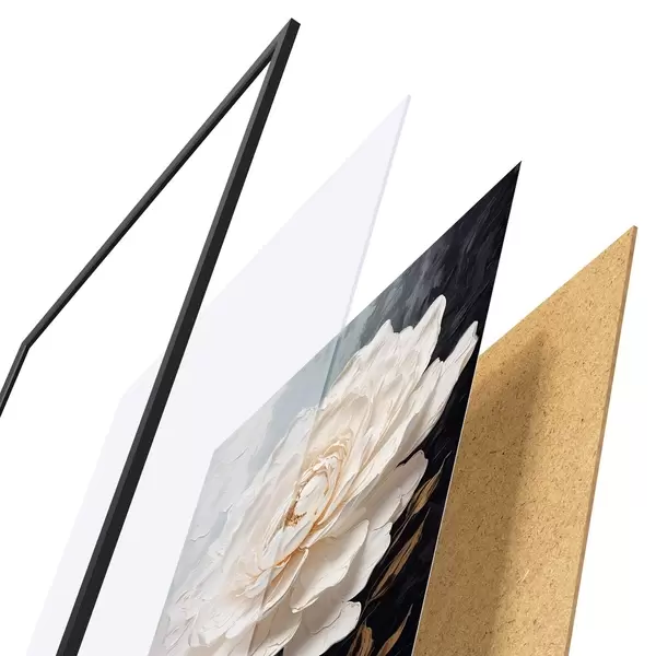 Das Poster besteht aus einem Rahmen, Plexiglas, einem gedruckten Bild und einer Rückwand aus Spanplatten. Dank der Halterungen auf der Rückseite kann das Poster sofort an die Wand gehängt werden.