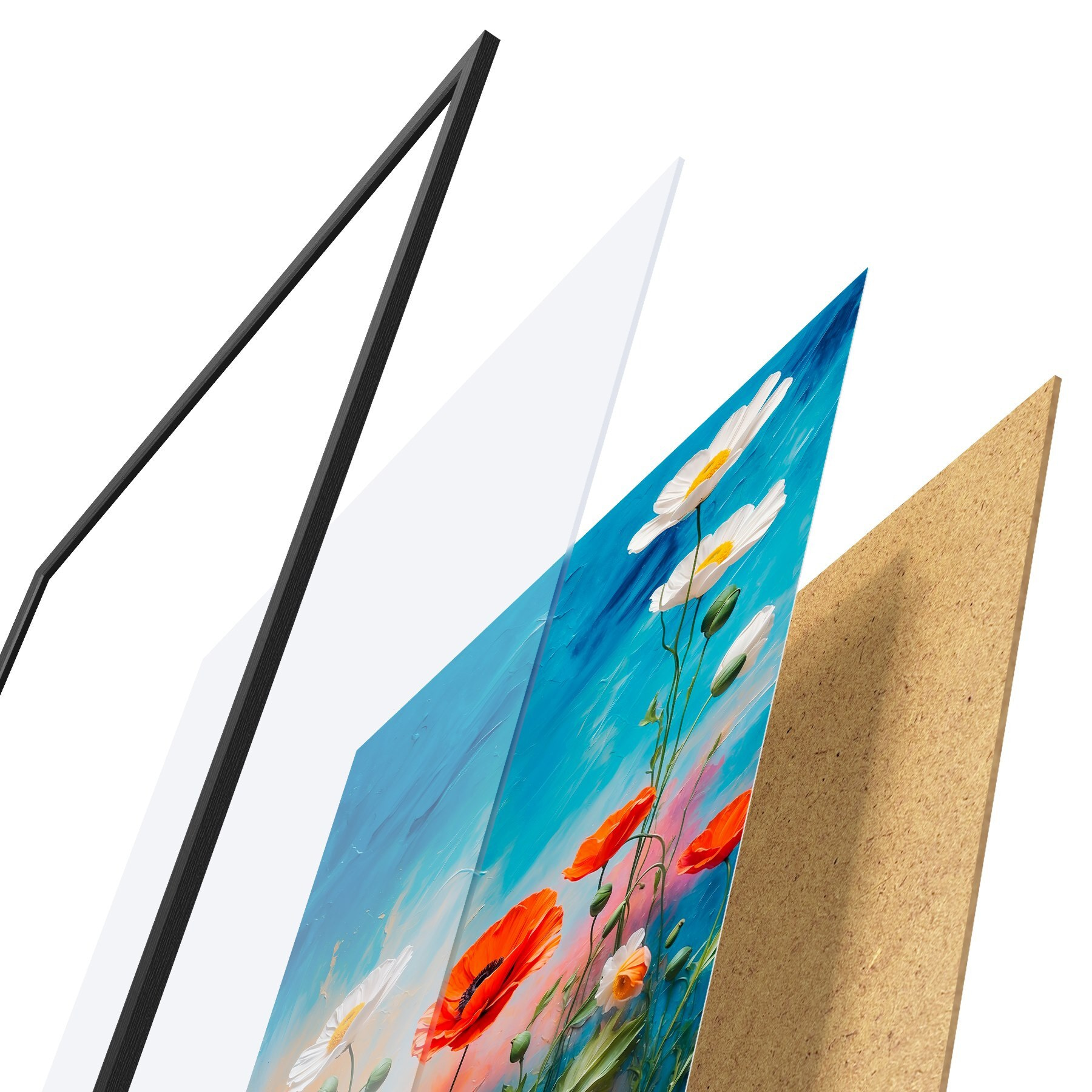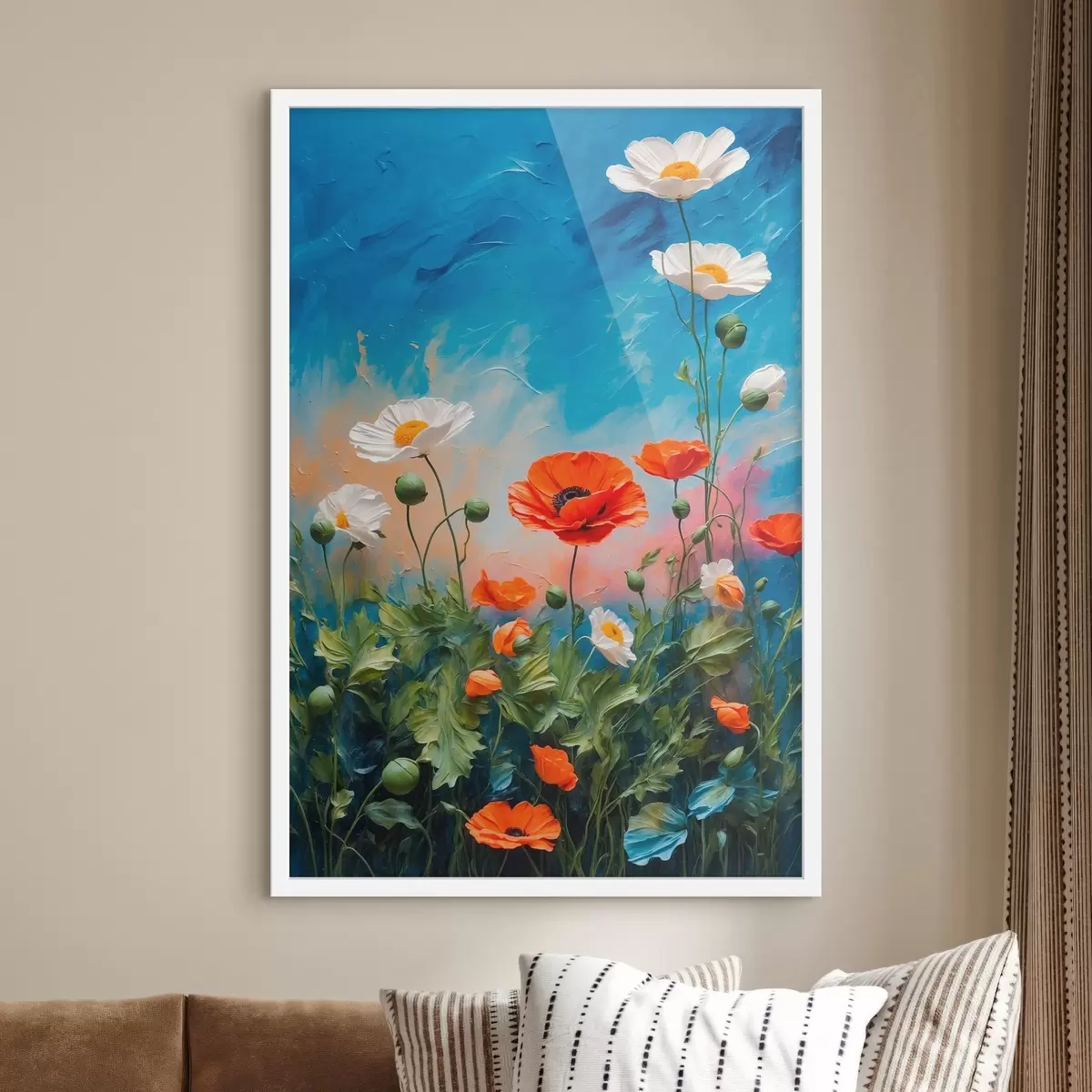 Poster Gänseblümchen und Mohnblumen auf blauem Hintergrund Nr f42261