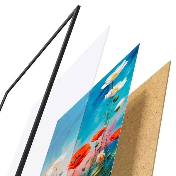 Das Poster besteht aus einem Rahmen, Plexiglas, einem gedruckten Bild und einer Rückwand aus Spanplatten. Dank der Halterungen auf der Rückseite kann das Poster sofort an die Wand gehängt werden.
