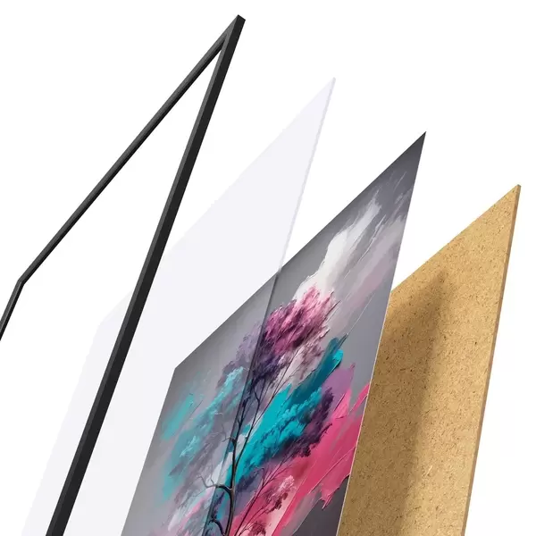 Das Poster besteht aus einem Rahmen, Plexiglas, einem gedruckten Bild und einer Rückwand aus Spanplatten. Dank der Halterungen auf der Rückseite kann das Poster sofort an die Wand gehängt werden.