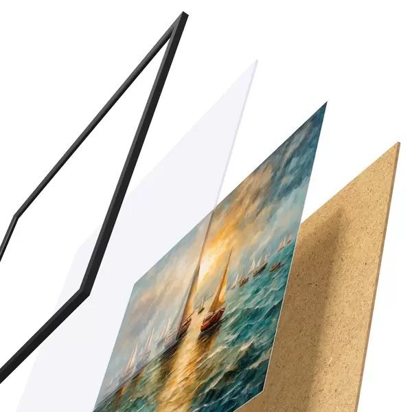 Das Poster besteht aus einem Rahmen, Plexiglas, einem gedruckten Bild und einer Rückwand aus Spanplatten. Dank der Halterungen auf der Rückseite kann das Poster sofort an die Wand gehängt werden.