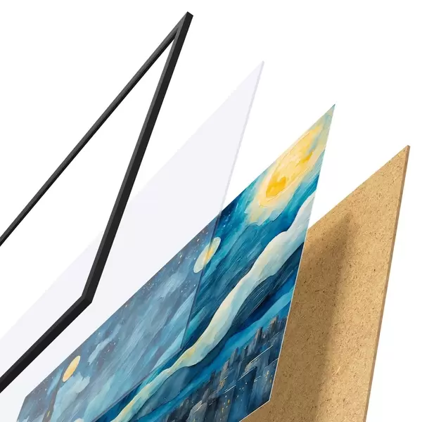 Das Poster besteht aus einem Rahmen, Plexiglas, einem gedruckten Bild und einer Rückwand aus Spanplatten. Dank der Halterungen auf der Rückseite kann das Poster sofort an die Wand gehängt werden.