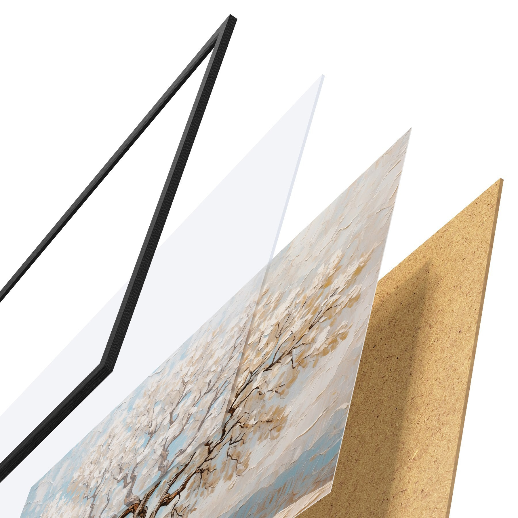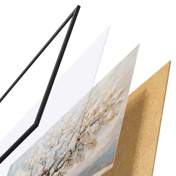 Das Poster besteht aus einem Rahmen, Plexiglas, einem gedruckten Bild und einer Rückwand aus Spanplatten. Dank der Halterungen auf der Rückseite kann das Poster sofort an die Wand gehängt werden.