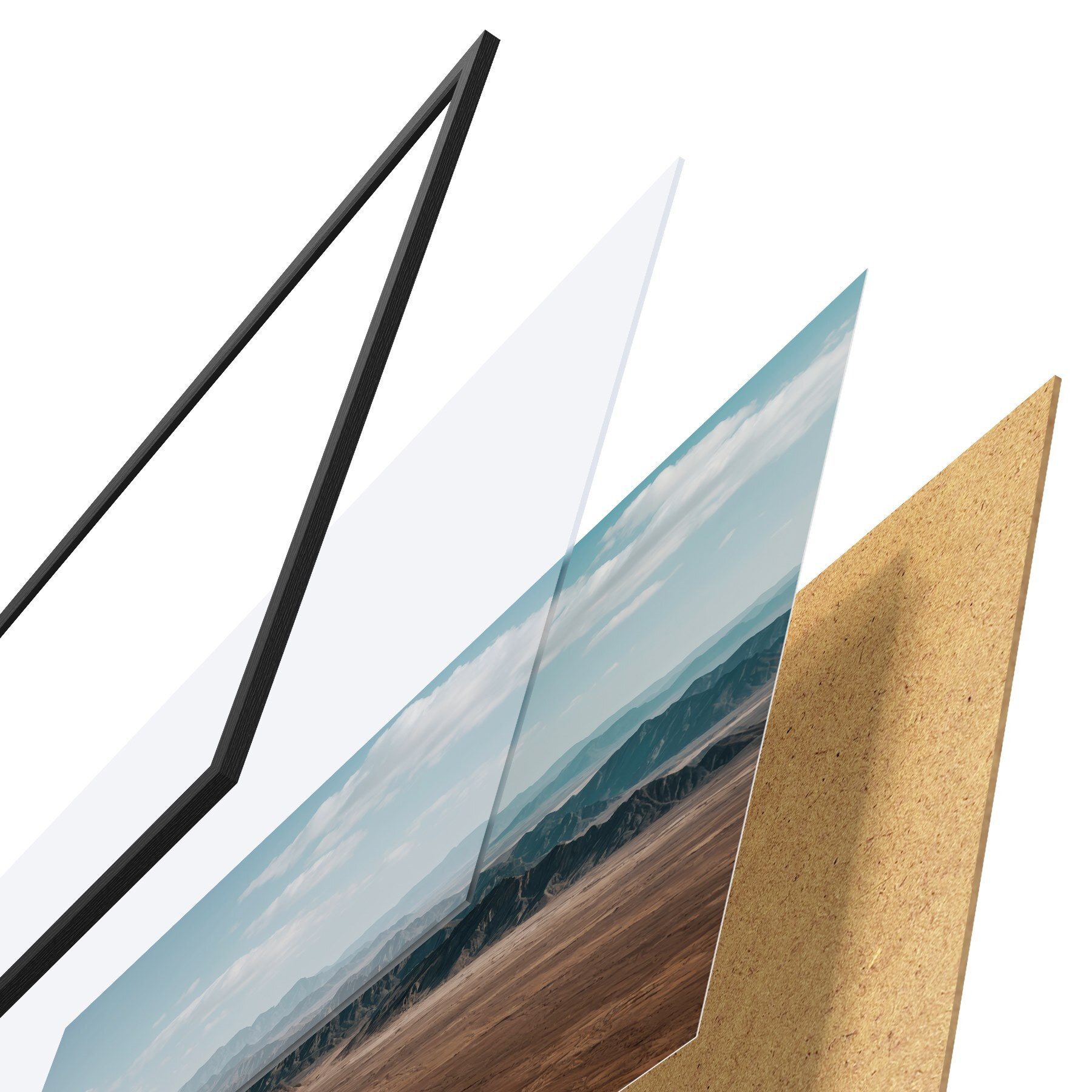 Das Poster besteht aus einem Rahmen, Plexiglas, einem gedruckten Bild und einer Rückwand aus Spanplatten. Dank der Halterungen auf der Rückseite kann das Poster sofort an die Wand gehängt werden.