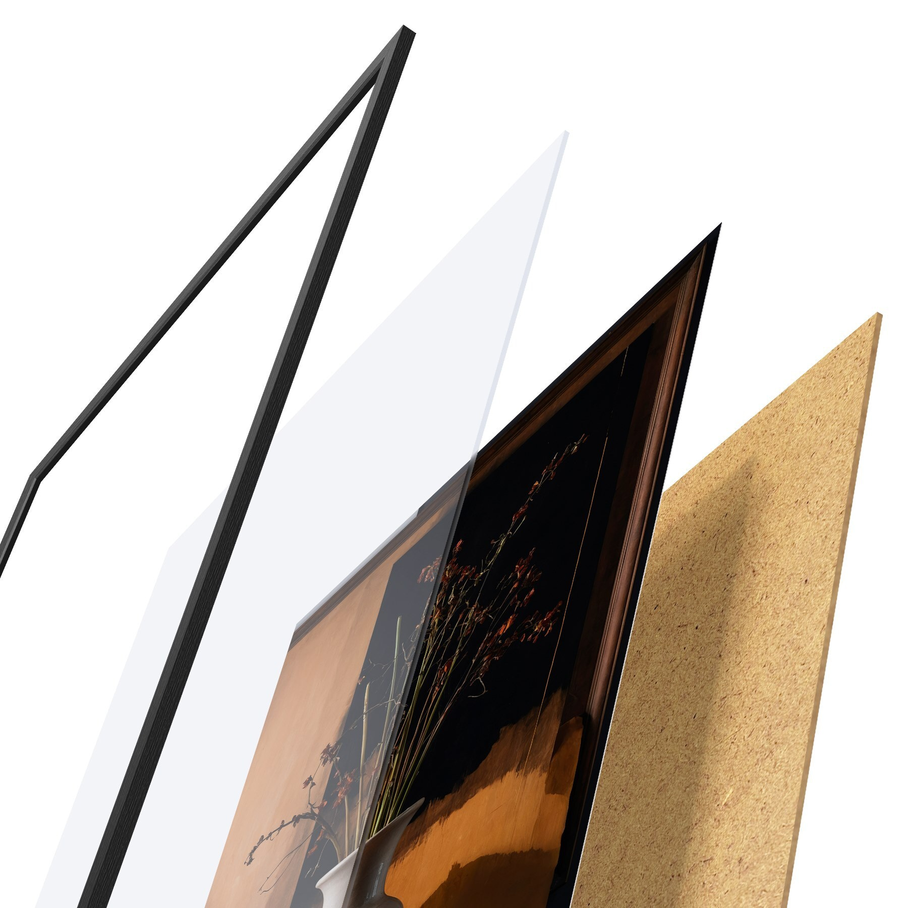 Das Poster besteht aus einem Rahmen, Plexiglas, einem gedruckten Bild und einer Rückwand aus Spanplatten. Dank der Halterungen auf der Rückseite kann das Poster sofort an die Wand gehängt werden.