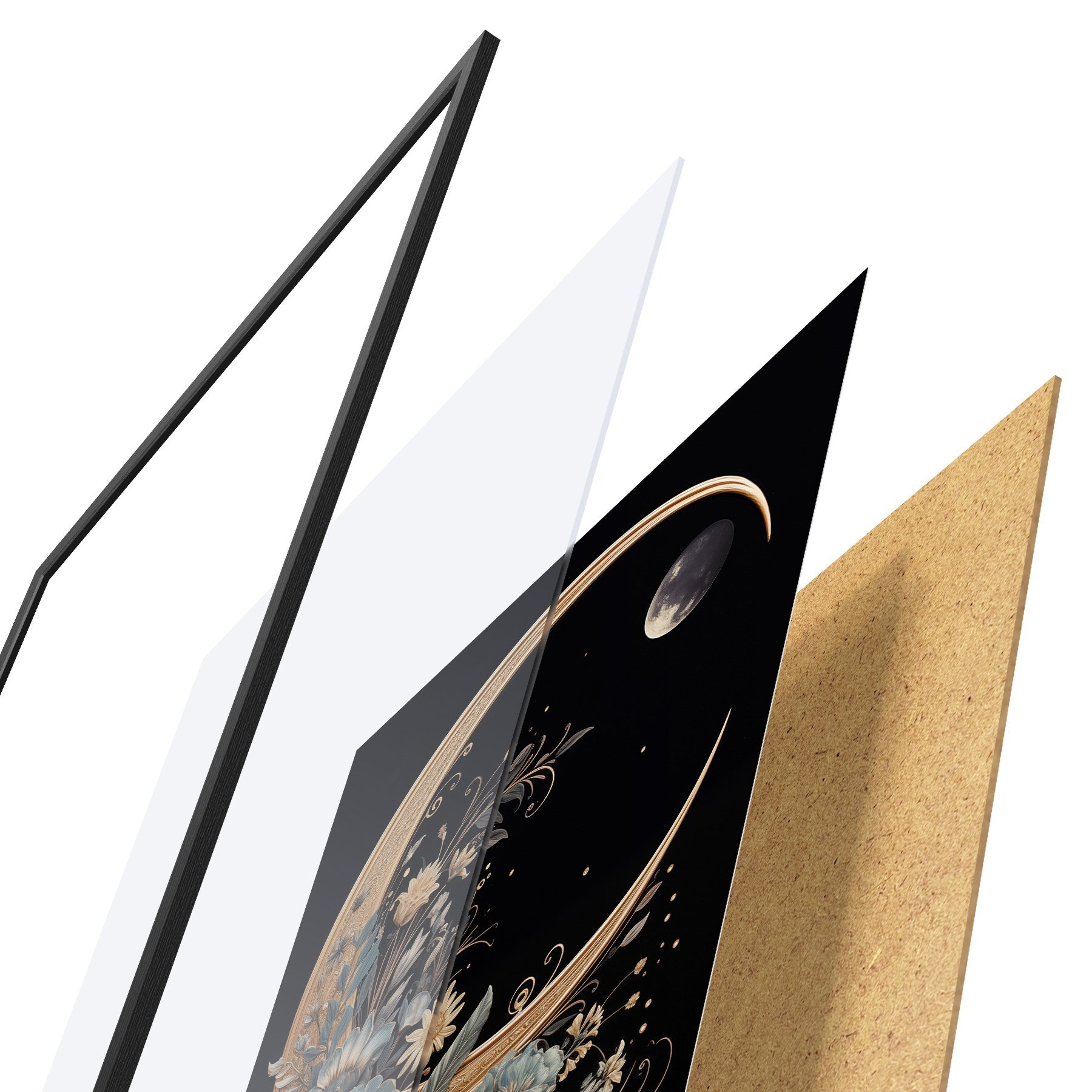 Das Poster besteht aus einem Rahmen, Plexiglas, einem gedruckten Bild und einer Rückwand aus Spanplatten. Dank der Halterungen auf der Rückseite kann das Poster sofort an die Wand gehängt werden.