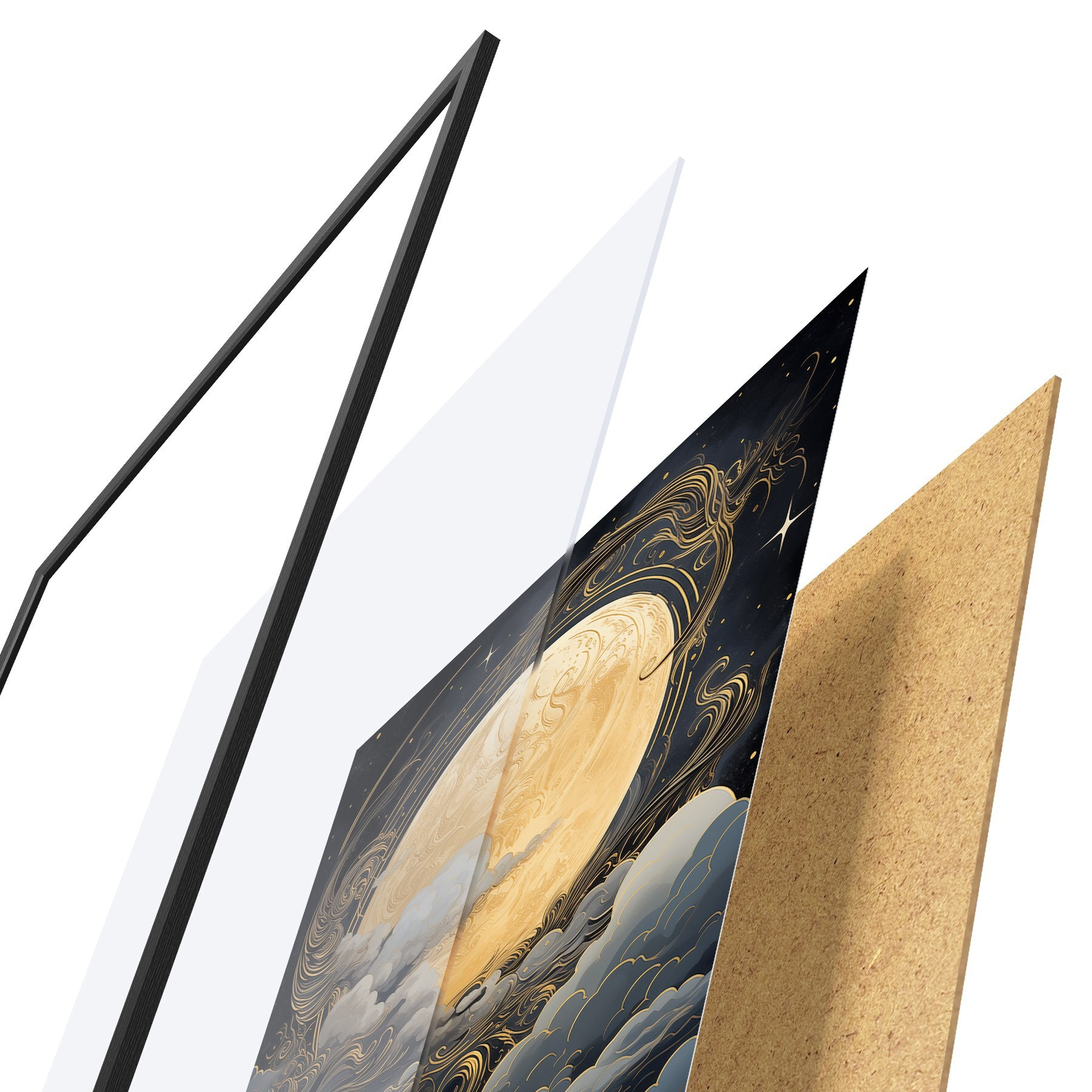 Das Poster besteht aus einem Rahmen, Plexiglas, einem gedruckten Bild und einer Rückwand aus Spanplatten. Dank der Halterungen auf der Rückseite kann das Poster sofort an die Wand gehängt werden.