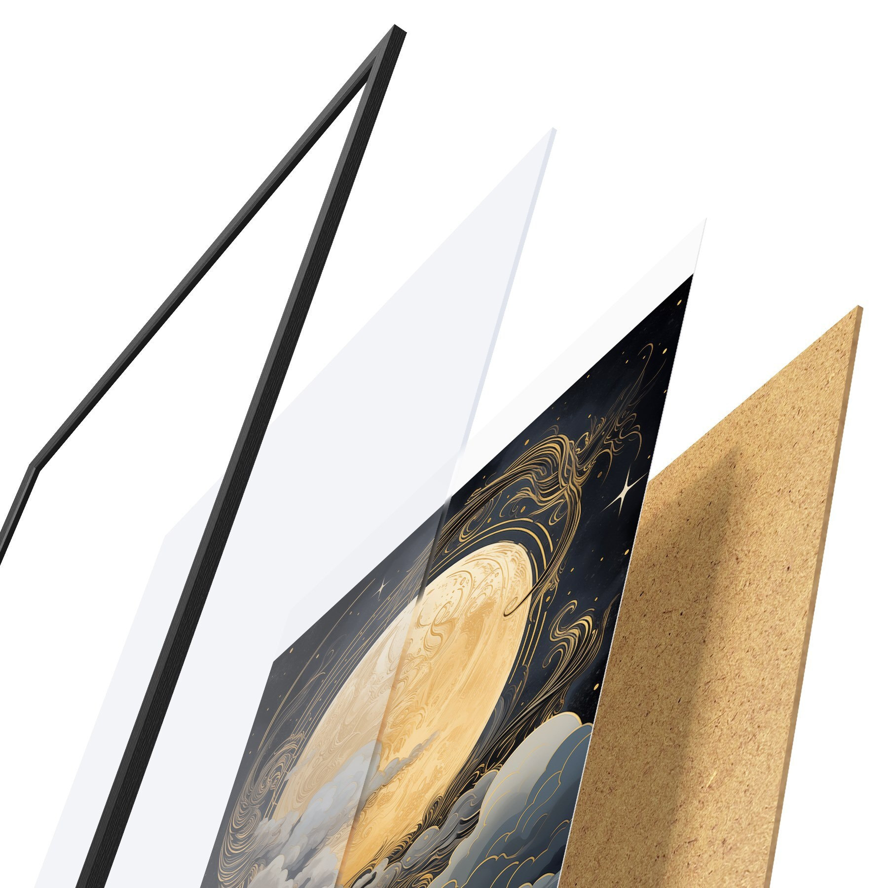 Das Poster besteht aus einem Rahmen, Plexiglas, einem gedruckten Bild und einer Rückwand aus Spanplatten. Dank der Halterungen auf der Rückseite kann das Poster sofort an die Wand gehängt werden.