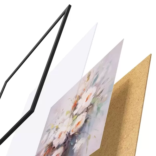 Das Poster besteht aus einem Rahmen, Plexiglas, einem gedruckten Bild und einer Rückwand aus Spanplatten. Dank der Halterungen auf der Rückseite kann das Poster sofort an die Wand gehängt werden.