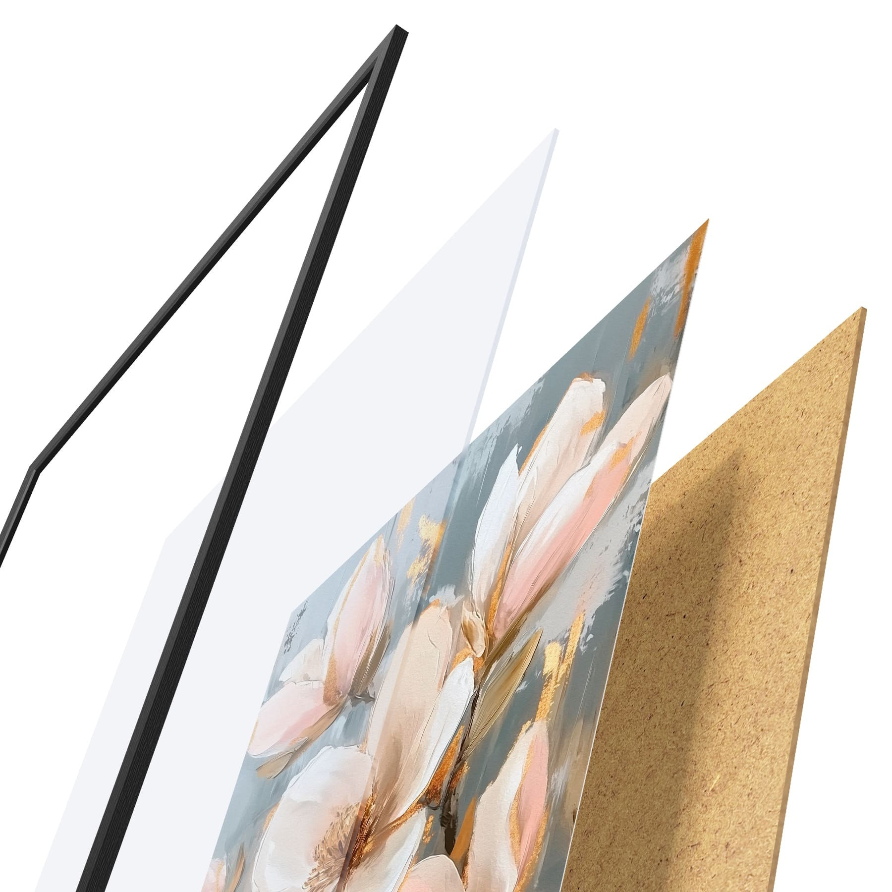 Das Poster besteht aus einem Rahmen, Plexiglas, einem gedruckten Bild und einer Rückwand aus Spanplatten. Dank der Halterungen auf der Rückseite kann das Poster sofort an die Wand gehängt werden.