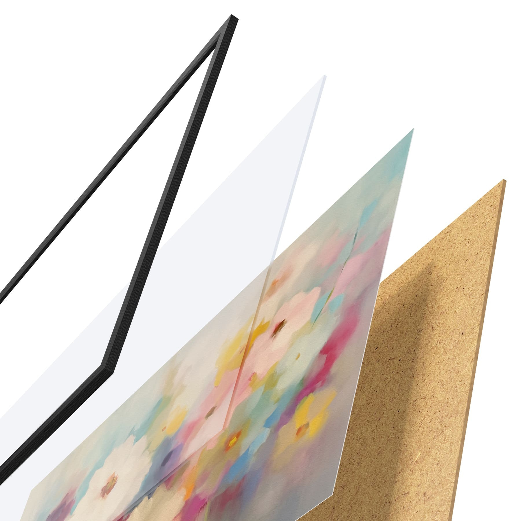 Das Poster besteht aus einem Rahmen, Plexiglas, einem gedruckten Bild und einer Rückwand aus Spanplatten. Dank der Halterungen auf der Rückseite kann das Poster sofort an die Wand gehängt werden.