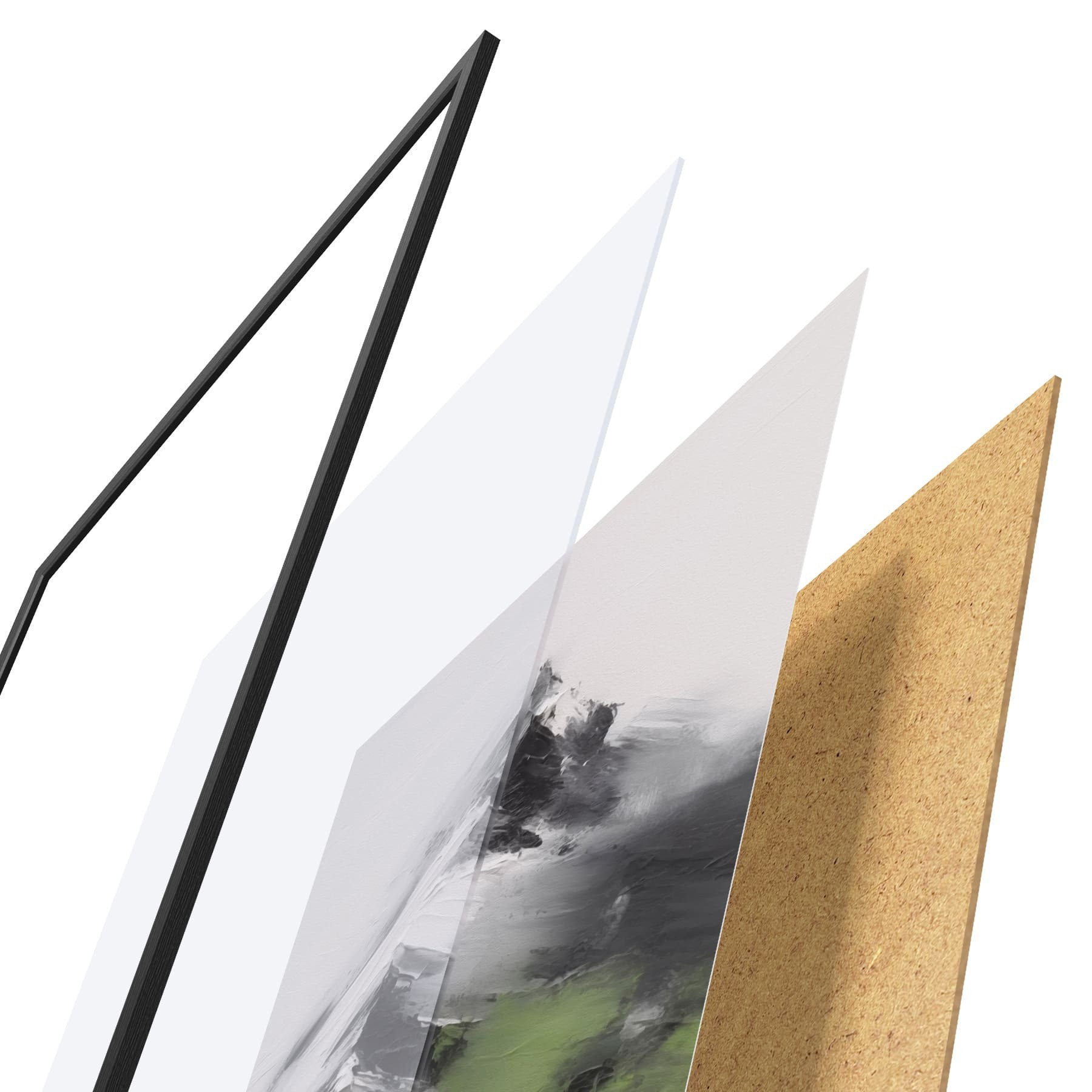 Das Poster besteht aus einem Rahmen, Plexiglas, einem gedruckten Bild und einer Rückwand aus Spanplatten. Dank der Halterungen auf der Rückseite kann das Poster sofort an die Wand gehängt werden.